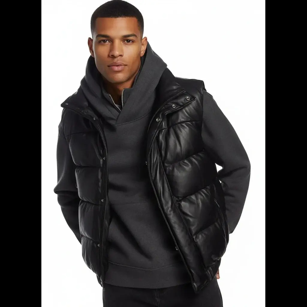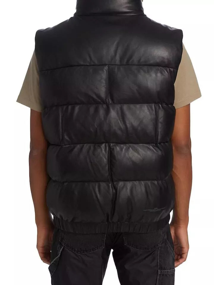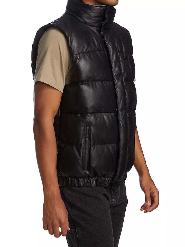 Men's Puffer Leather Waistcoat Black Padded Lambskin Leather Casual Vest