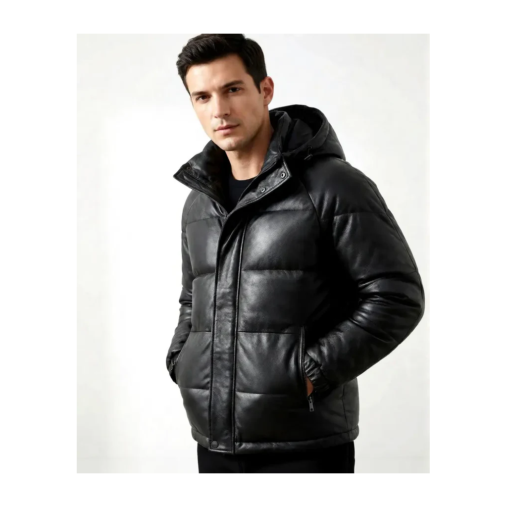 Men Black Hooded Puffer Jacket Genuine Lambskin Leather Quilted Puffer Coat