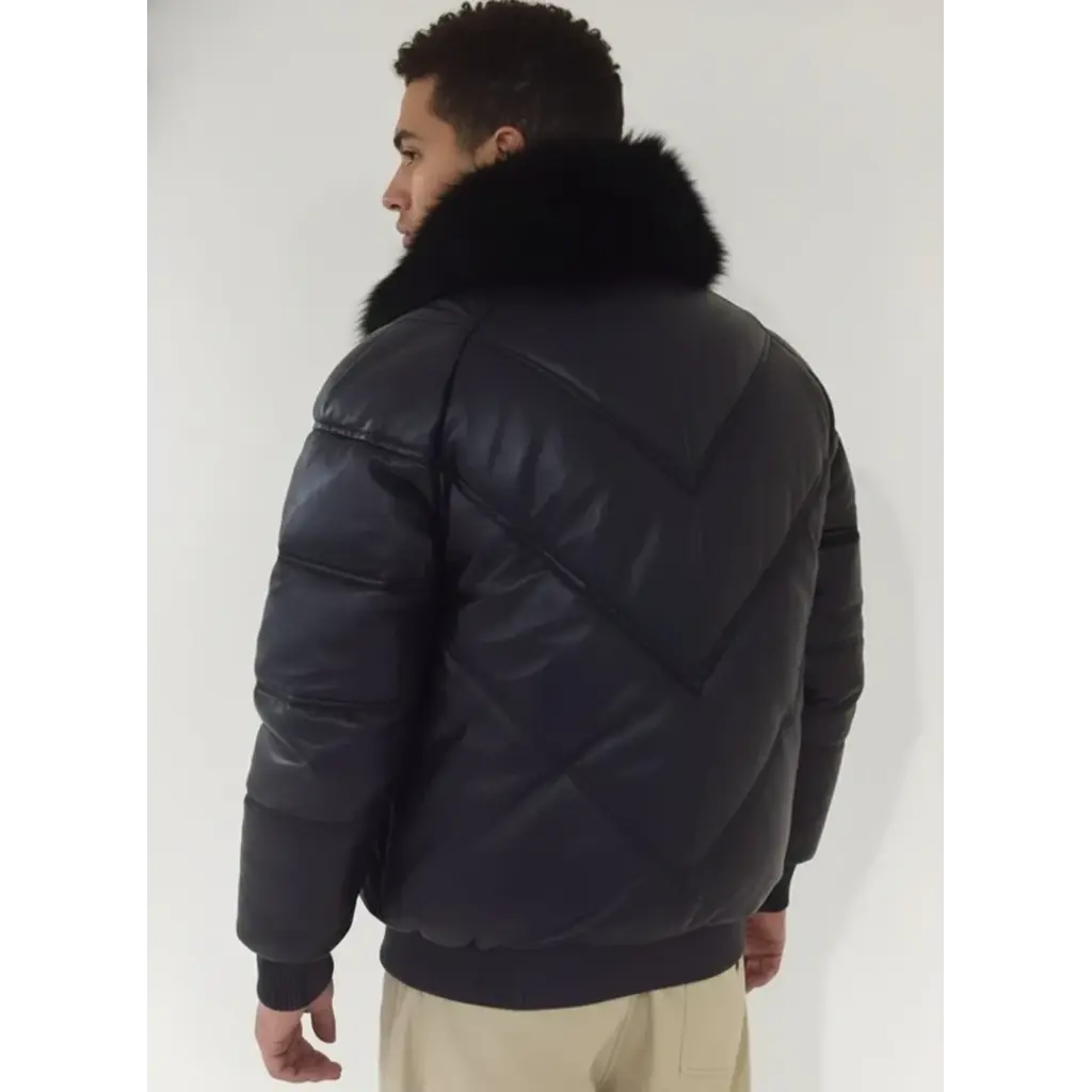 Men Down Puffer Leather Jacket Bomber V Style Puffy With Removable Collar Coat