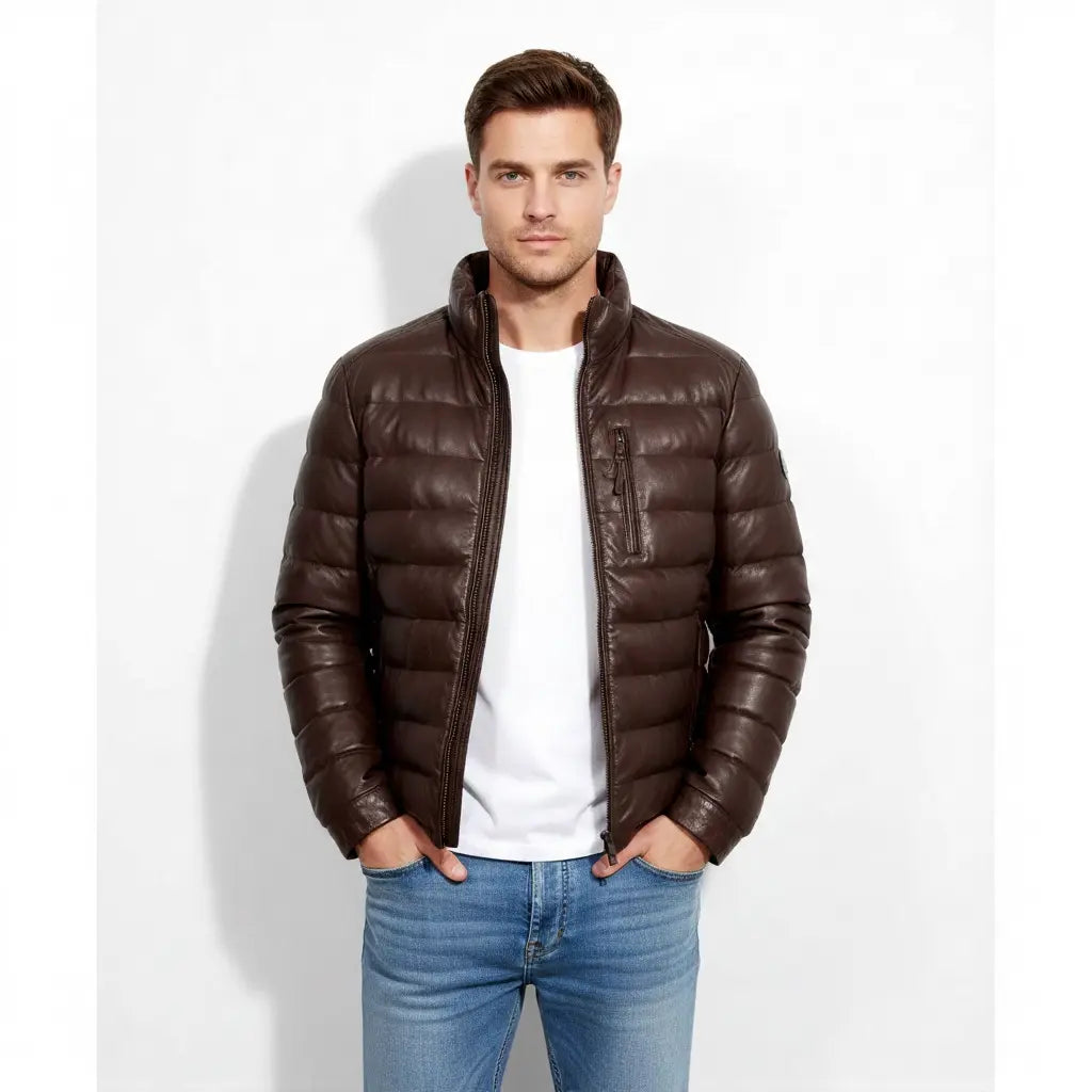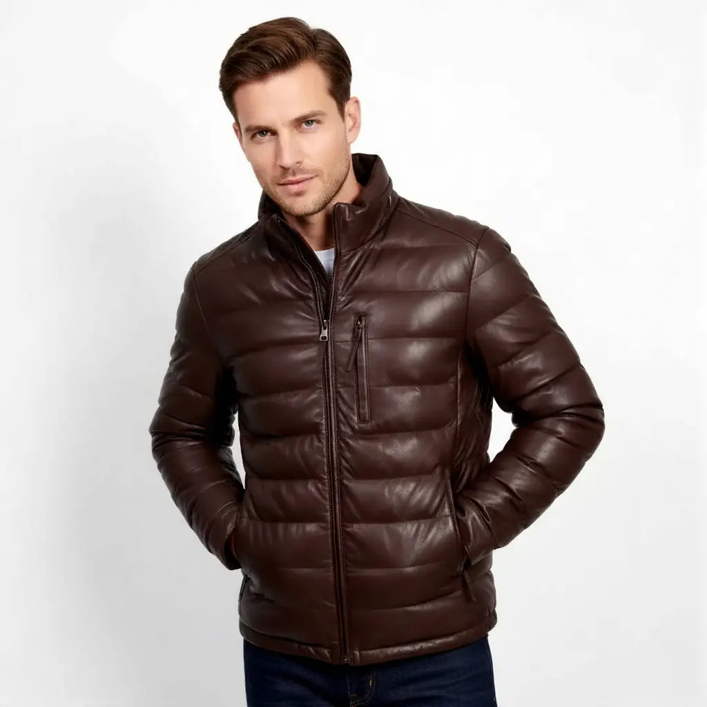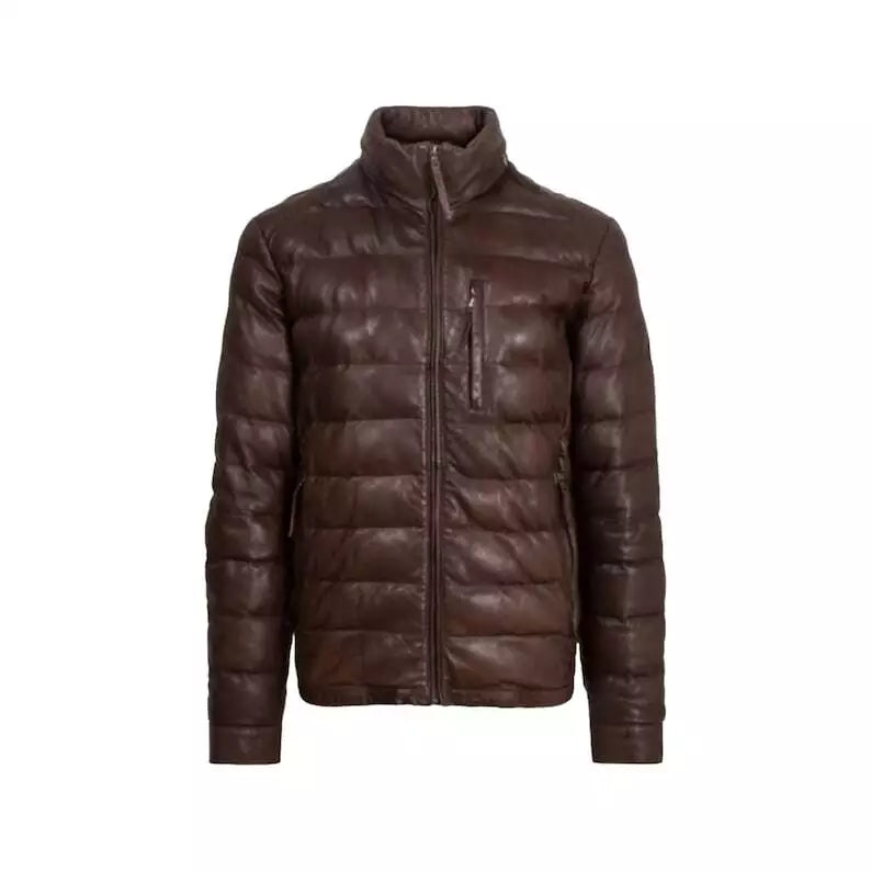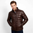 Embrace a classic yet modern look with this Men's Handmade Vintage Dark Brown Lambskin Leather Puffer Jacket. Made from premium lambskin leather, this jacket combines the luxurious texture and durability of leather with the comfort and warmth of a puffer design. Its vintage dark brown color and timeless style make it a versatile piece that can easily transition from casual to more polished outfits. The quilted puffer construction ensures excellent insulation, while the soft inner lining keeps you cozy during the colder months. Handmade with attention to detail, this jacket is a statement piece for any wardrobe.