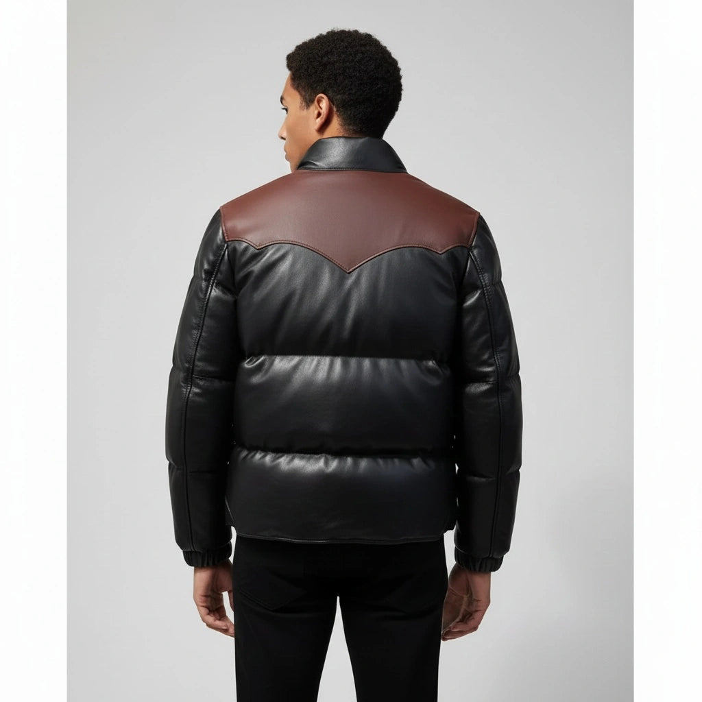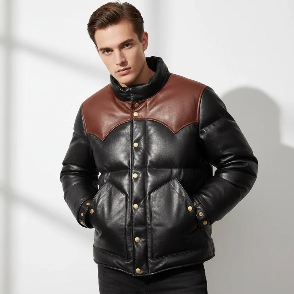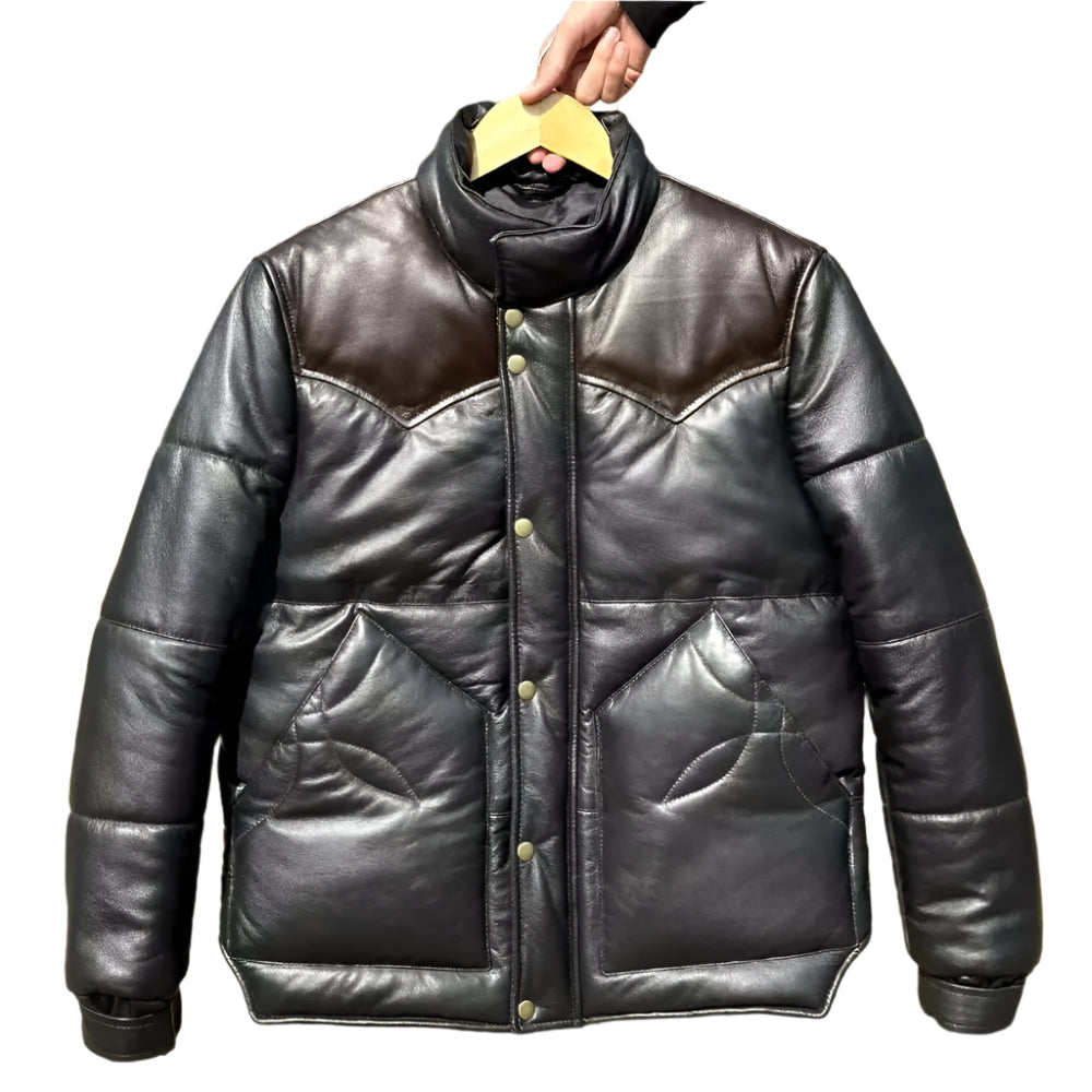 The Men’s Puffer Jacket Real Lambskin Leather Quilted Bomber Jacket in dual colors is a versatile and stylish outerwear piece. Whether you're braving the cold or simply want to add a statement piece to your wardrobe, this jacket combines the elegance of lambskin leather with the practicality of a quilted puffer design.