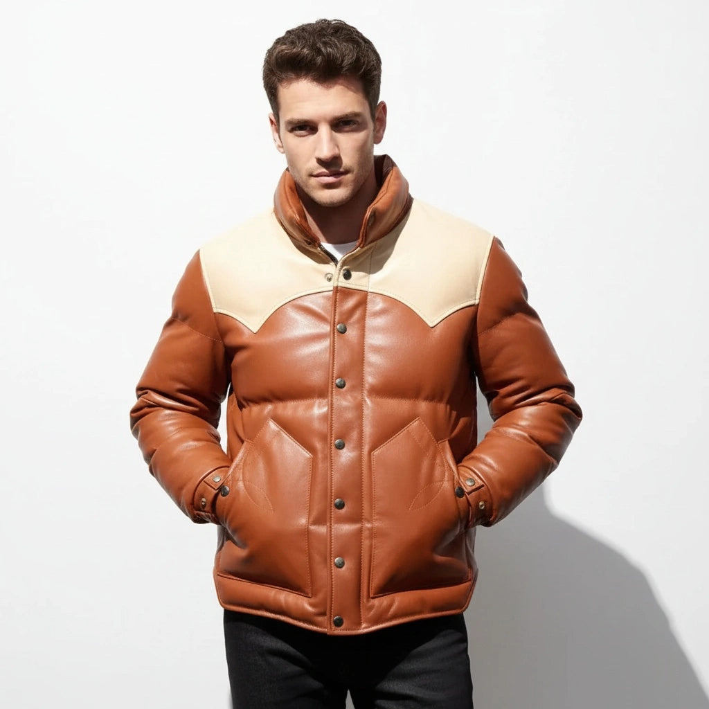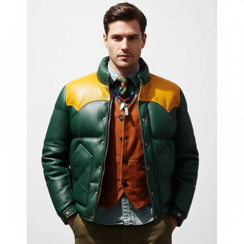 The Men’s Puffer Jacket Real Lambskin Leather Quilted Bomber Jacket in dual colors is the perfect blend of luxury and functionality. Crafted from genuine lambskin leather, this jacket offers superior softness and durability while keeping you warm and stylish. The quilted puffer design enhances its insulation, making it ideal for colder weather, while the sleek bomber style adds an edgy, modern touch. The dual-color scheme provides a unique, eye-catching contrast, making this jacket a standout piece in any wardrobe. Whether you’re looking for warmth on a chilly day or a bold fashion statement, this jacket is designed to offer both comfort and style.