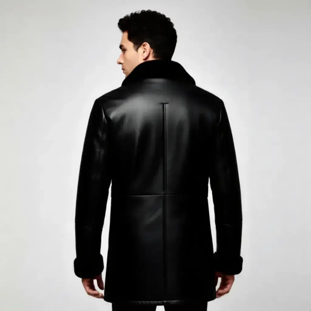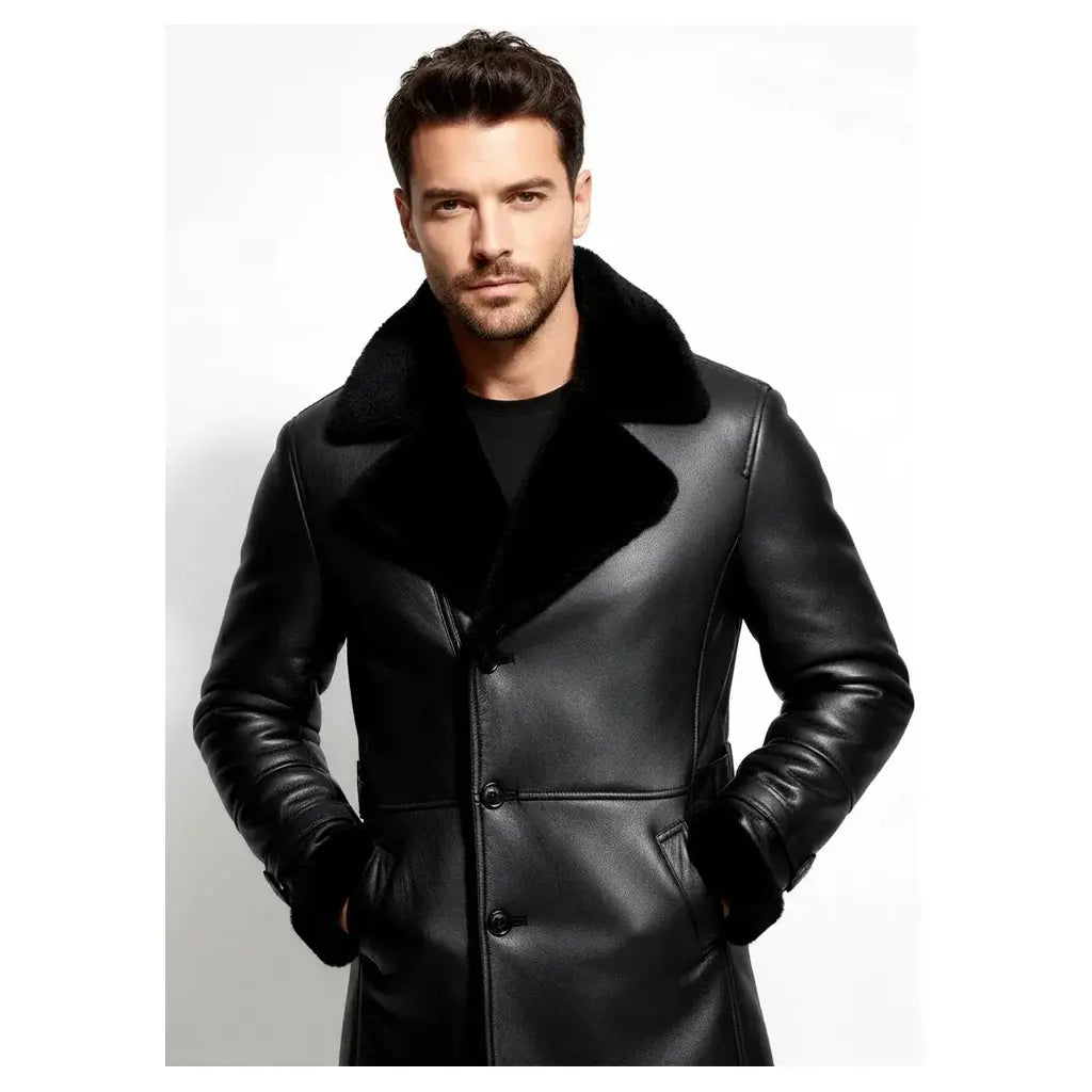 Men`s RAF Trench Coat Black Real Sheepskin Shearling Leather Jacket