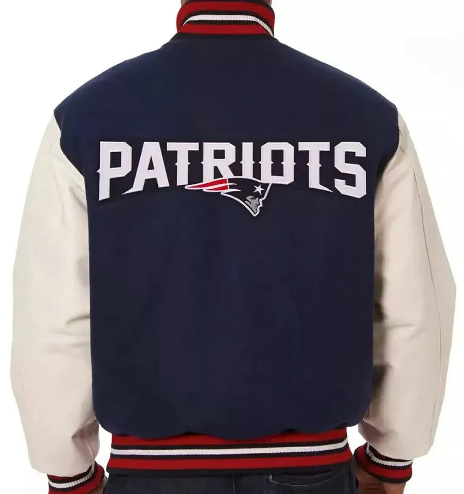 Letterman New England Patriots Navy Blue Varsity Jacket Wth Real Leather Sleeves