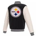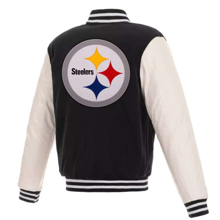 Rep your Pittsburgh Steelers in ultimate style with this varsity jacket, featuring a wool body and premium real leather sleeves. The embroidered Steelers logo brings authenticity, while the ribbed collar, cuffs, and waistband ensure a perfect, comfortable fit. Whether you're cheering from the stands or showing off your team spirit casually, this jacket combines classic varsity design with bold Steelers pride."