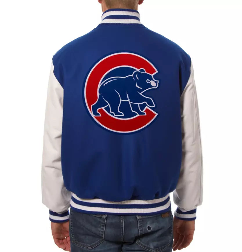 Show your Chicago Cubs pride with this Men’s Blue Letterman Varsity Jacket, featuring blue wool and white genuine leather sleeves. This jacket combines a bold, sporty design with premium materials, making it a must-have for any true Cubs fan. The iconic Cubs logo on the chest adds an authentic touch, allowing you to represent your team in style wherever you go.
