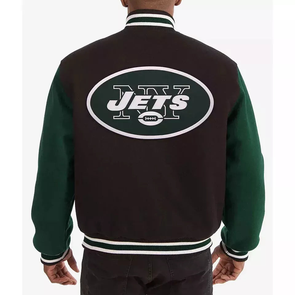 Display your New York Jets pride with this sleek letterman varsity jacket. The high-quality black and green wool body, paired with genuine leather sleeves, creates a striking contrast. Embroidered Jets logos and ribbed details enhance the jacket’s authenticity, while the tailored fit ensures comfort for any occasion. Perfect for game day, this jacket combines style and team spirit effortlessly."