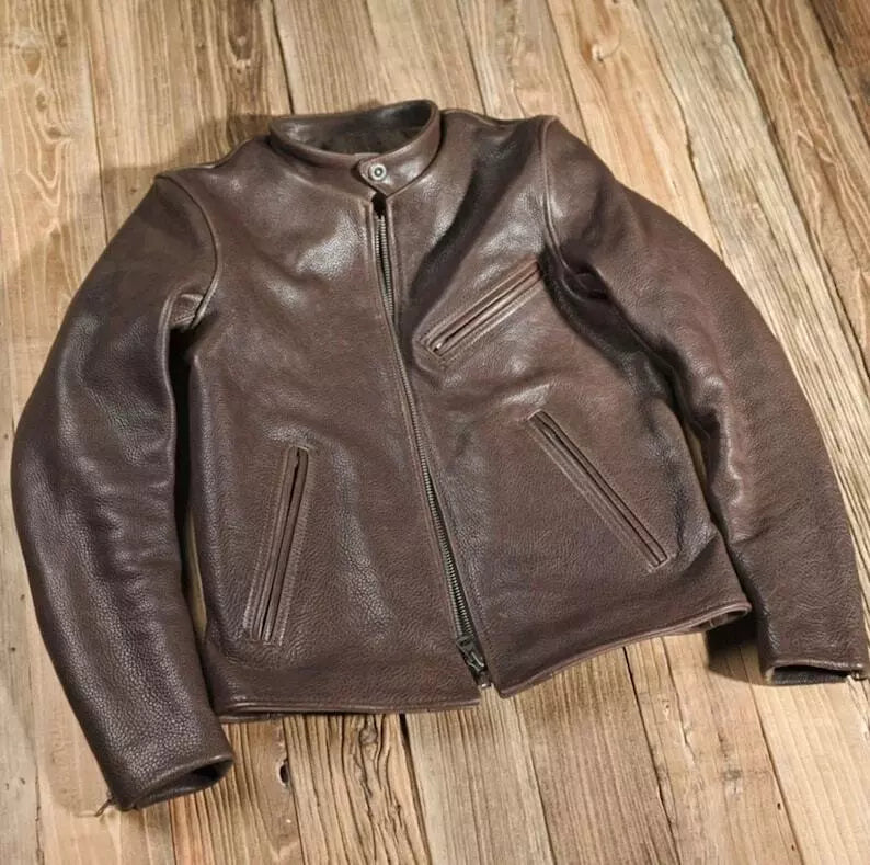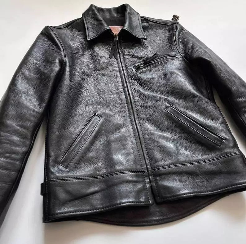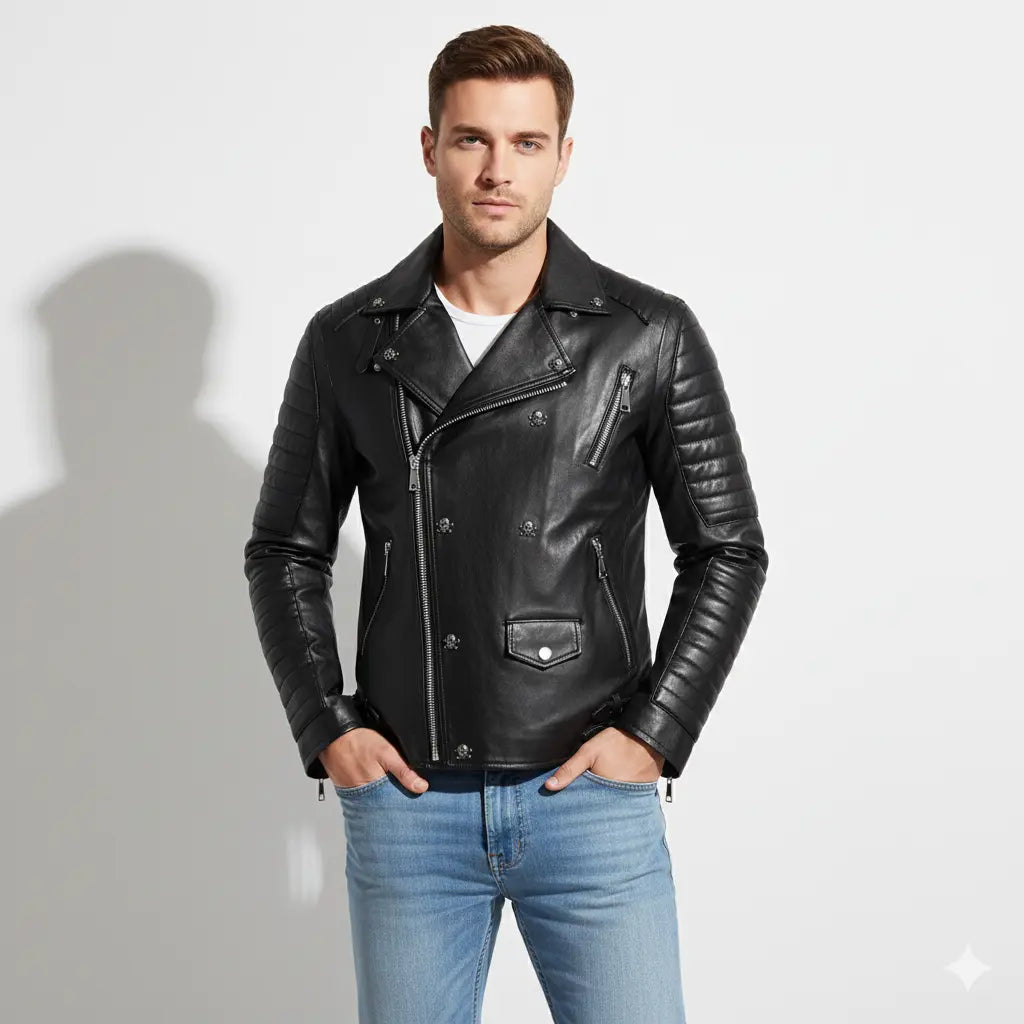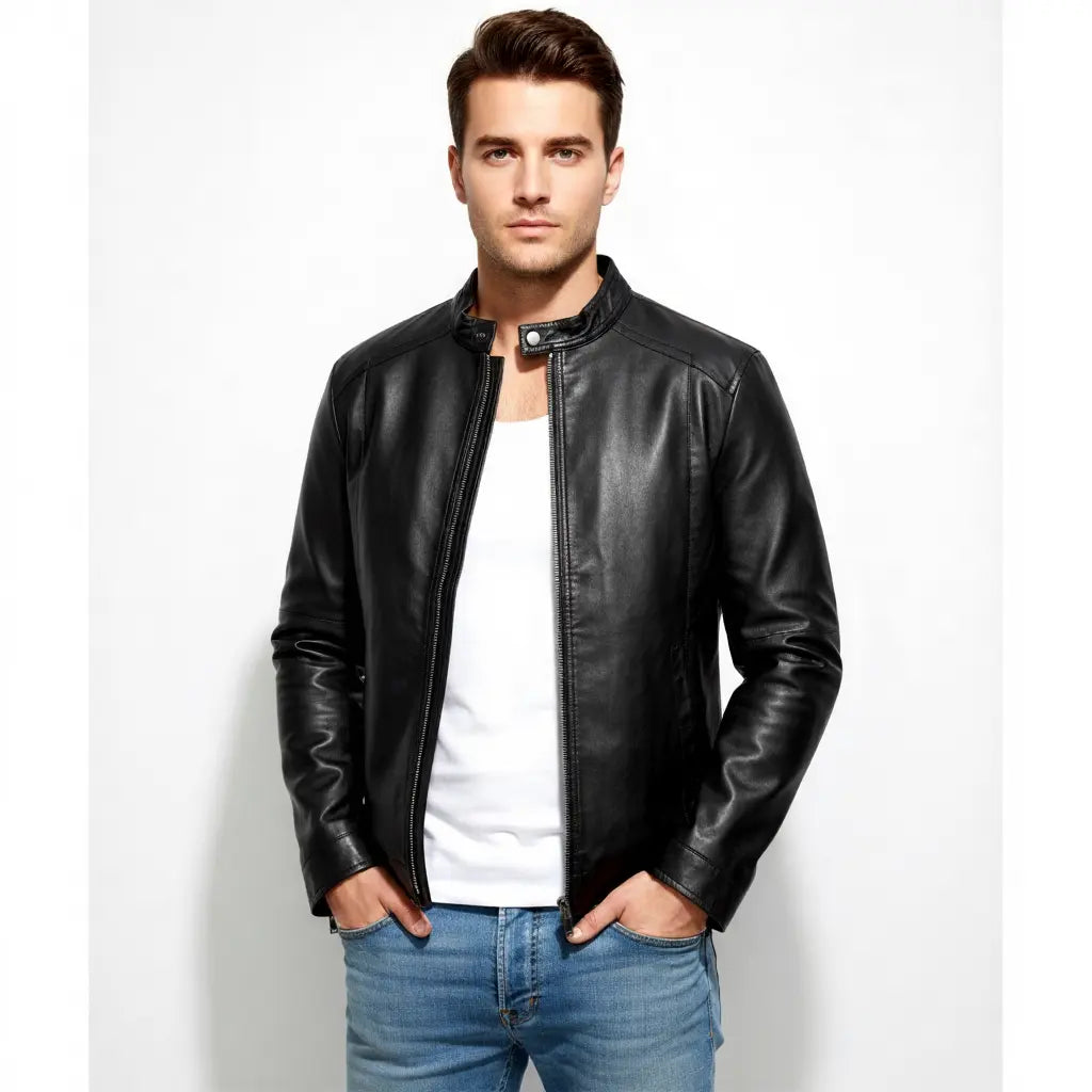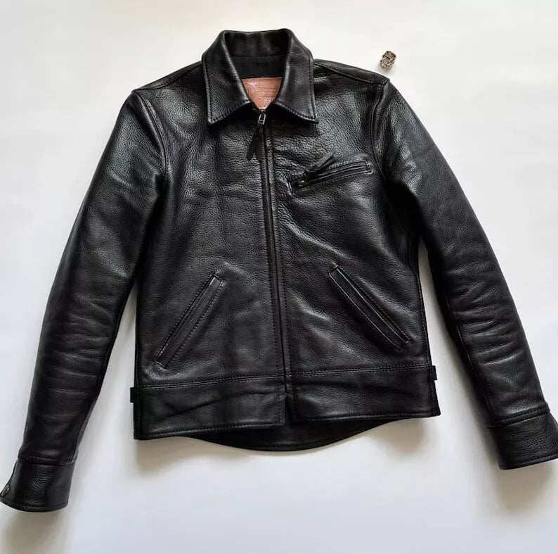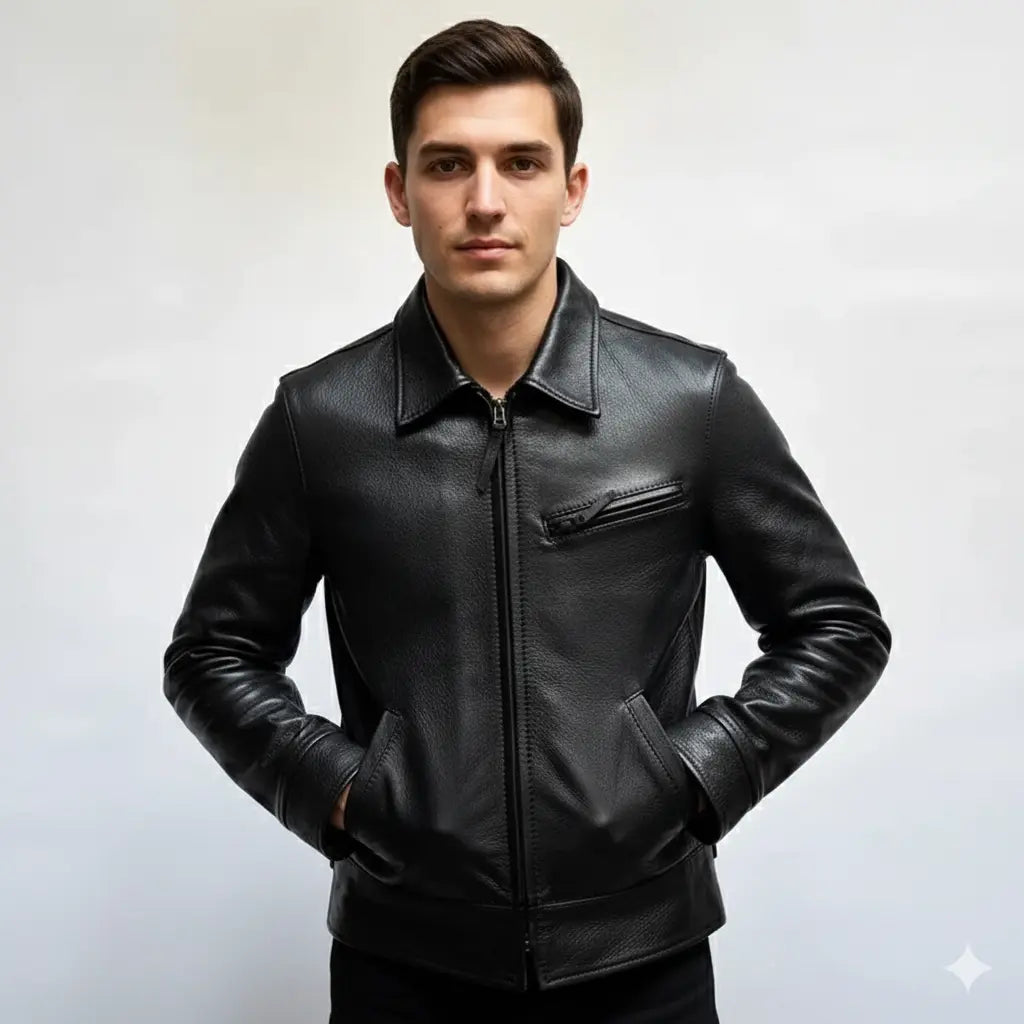 Premium men's leather jackets in biker, bomber, racer and classic styles. Explore motorcycle leather jackets with asymmetric zippers, vintage bomber jackets with ribbed cuffs, cafe racer designs, flight jackets, trucker styles, moto jackets with quilted shoulders and contemporary minimalist designs. Features include genuine leather construction, YKK zippers, multiple pockets, interior lining and expert craftsmanship. Perfect for motorcycle riders, everyday style and timeless leather outerwear that ages beautifully!