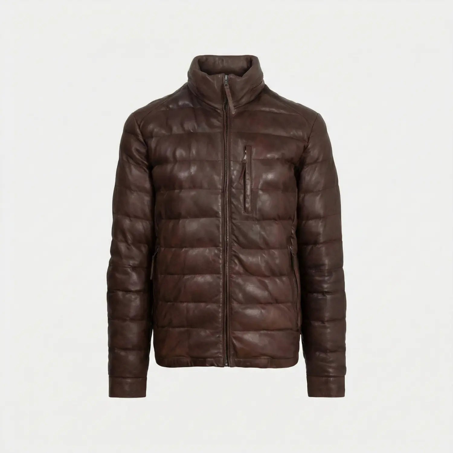 Embrace a classic yet modern look with this Men's Handmade Vintage Dark Brown Lambskin Leather Puffer Jacket. Made from premium lambskin leather, this jacket combines the luxurious texture and durability of leather with the comfort and warmth of a puffer design. Its vintage dark brown color and timeless style make it a versatile piece that can easily transition from casual to more polished outfits. The quilted puffer construction ensures excellent insulation, while the soft inner lining keeps you cozy during the colder months. Handmade with attention to detail, this jacket is a statement piece for any wardrobe.