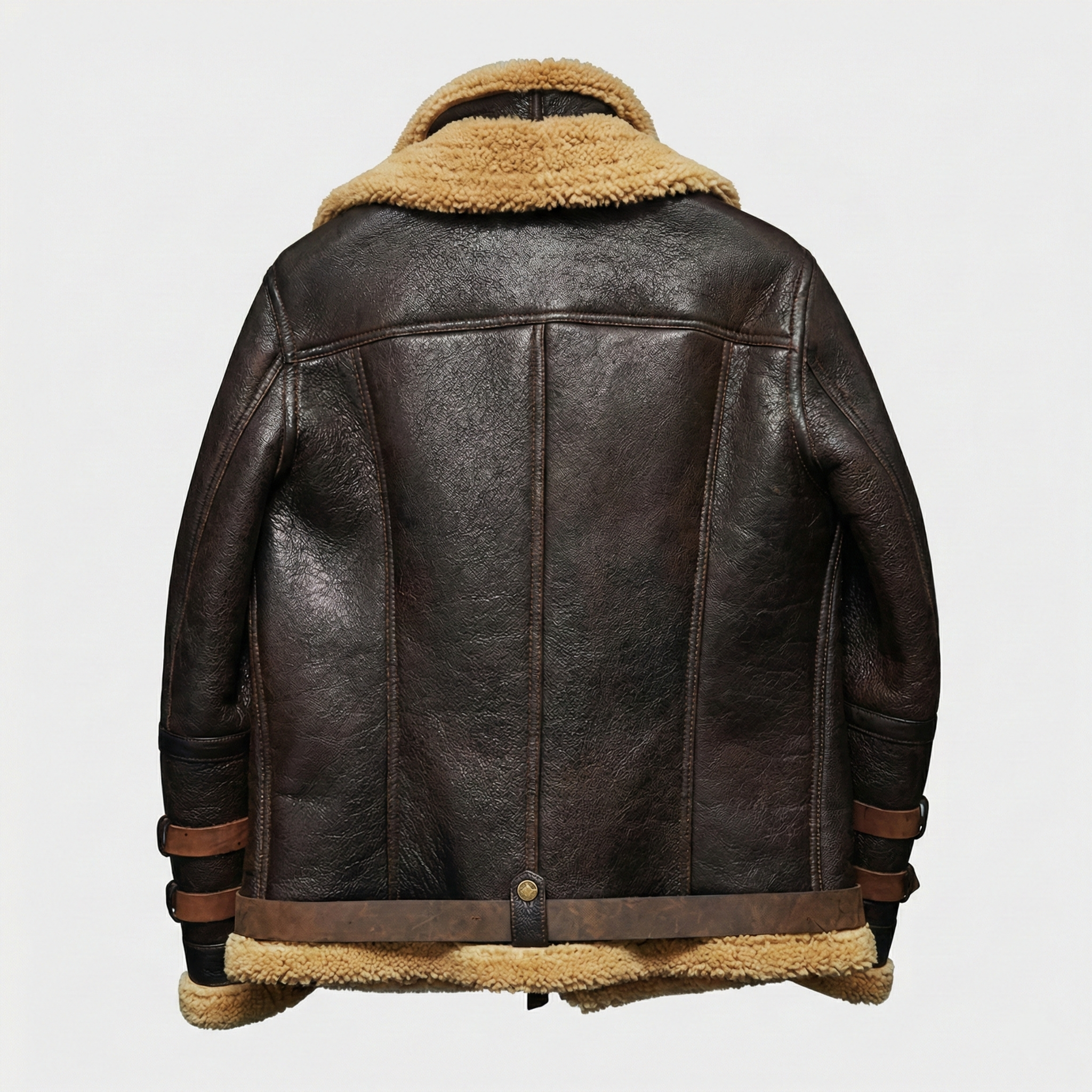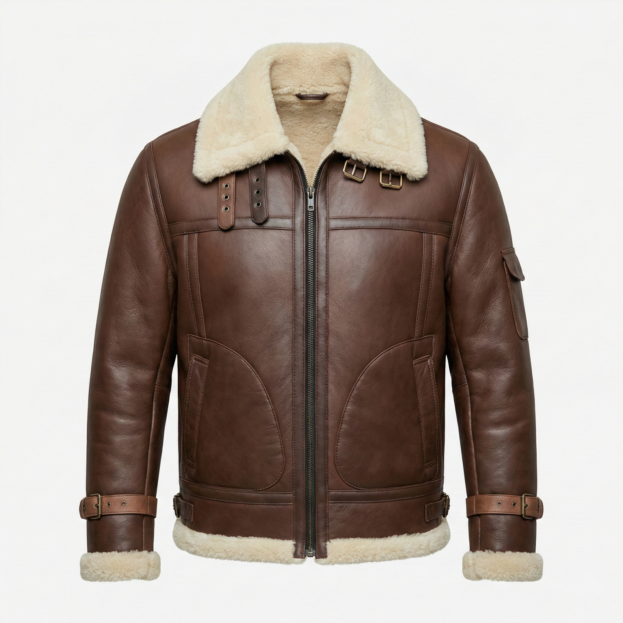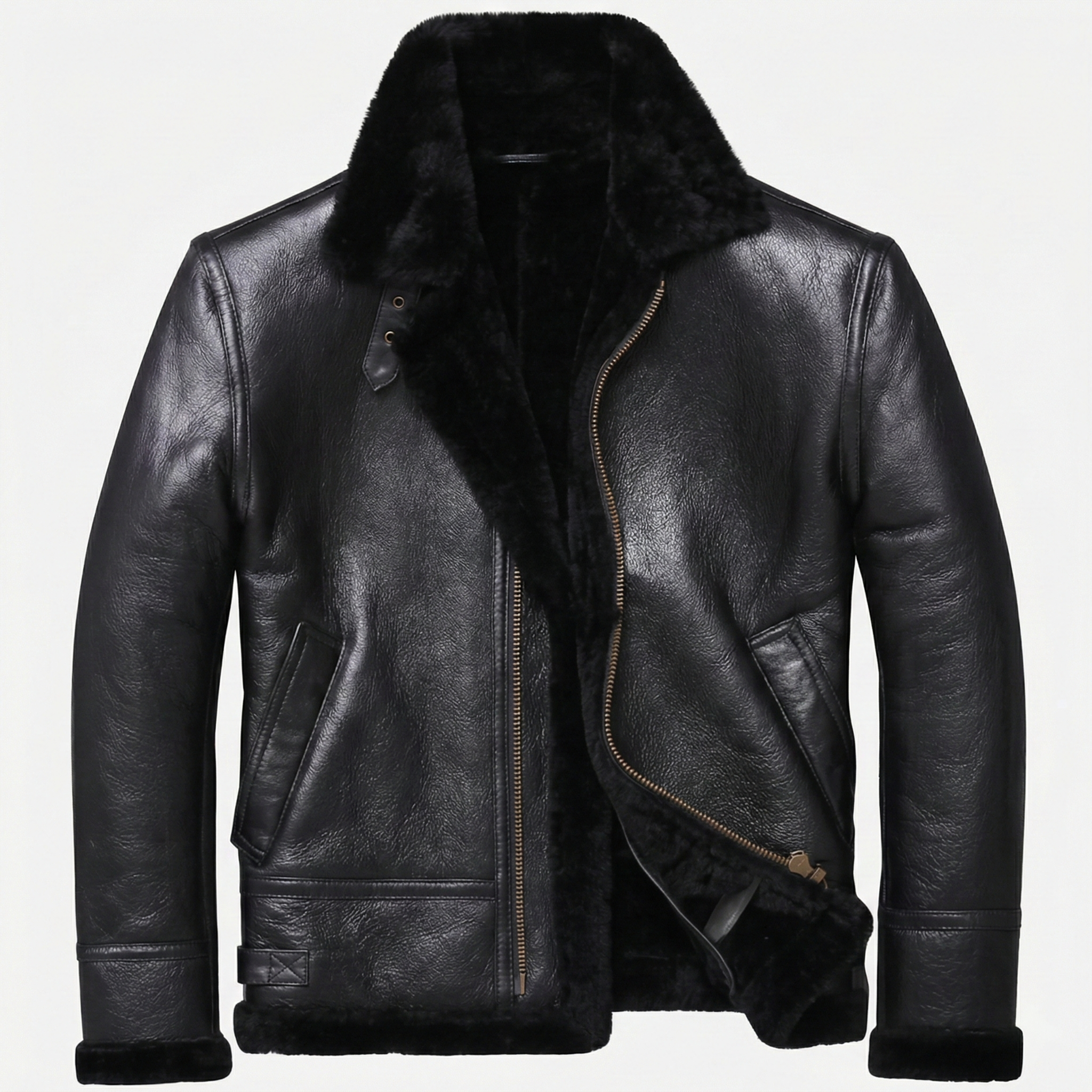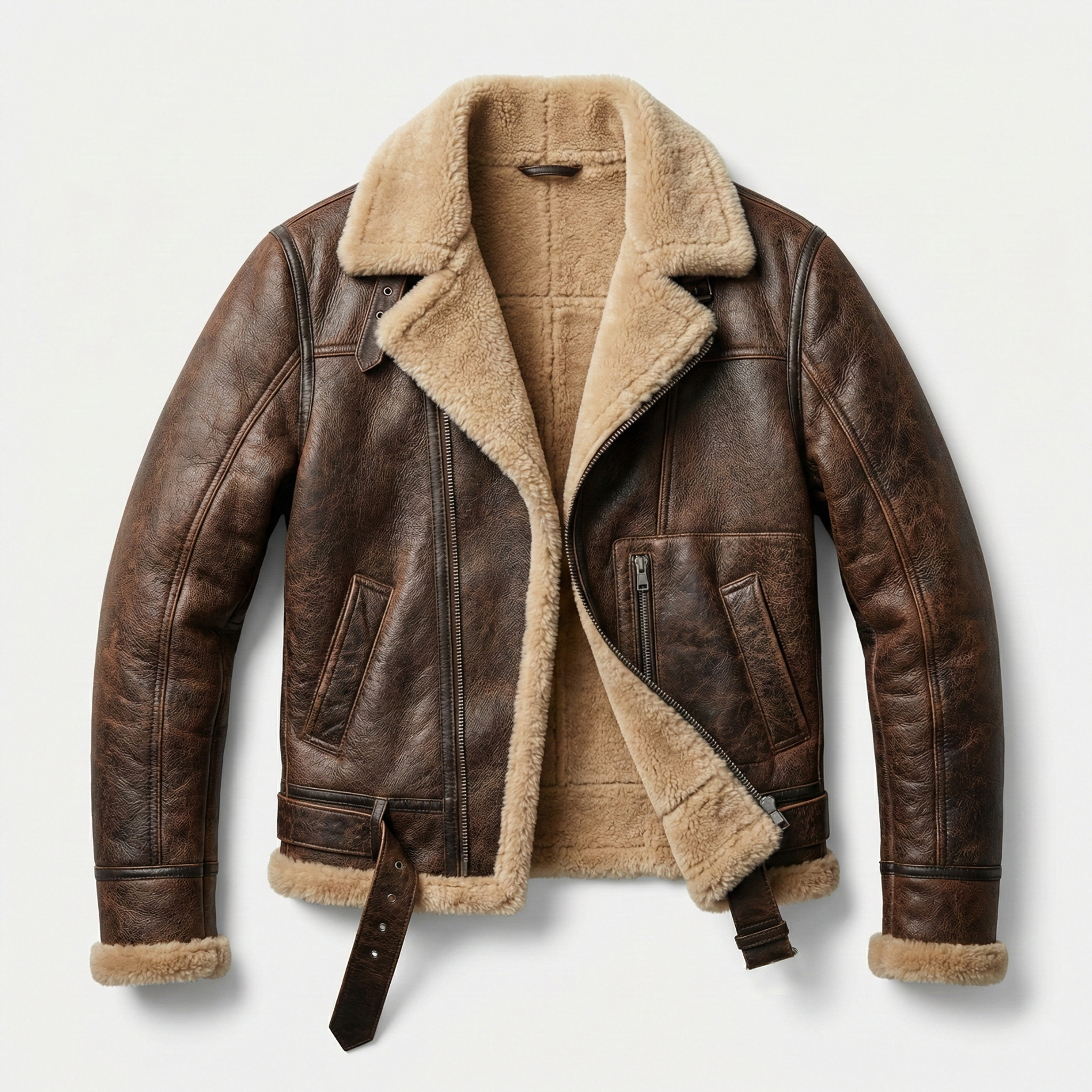 Premium men's shearling jackets in aviator, bomber, biker and classic coat styles. Explore B3 flight jackets, shearling-lined leather bombers, motorcycle-inspired designs, long shearling coats and vintage aviator styles. Each jacket features genuine sheepskin leather exterior, natural shearling fur lining and authentic details like buckled collars, zippered pockets and belted waists for ultimate warmth and timeless style.