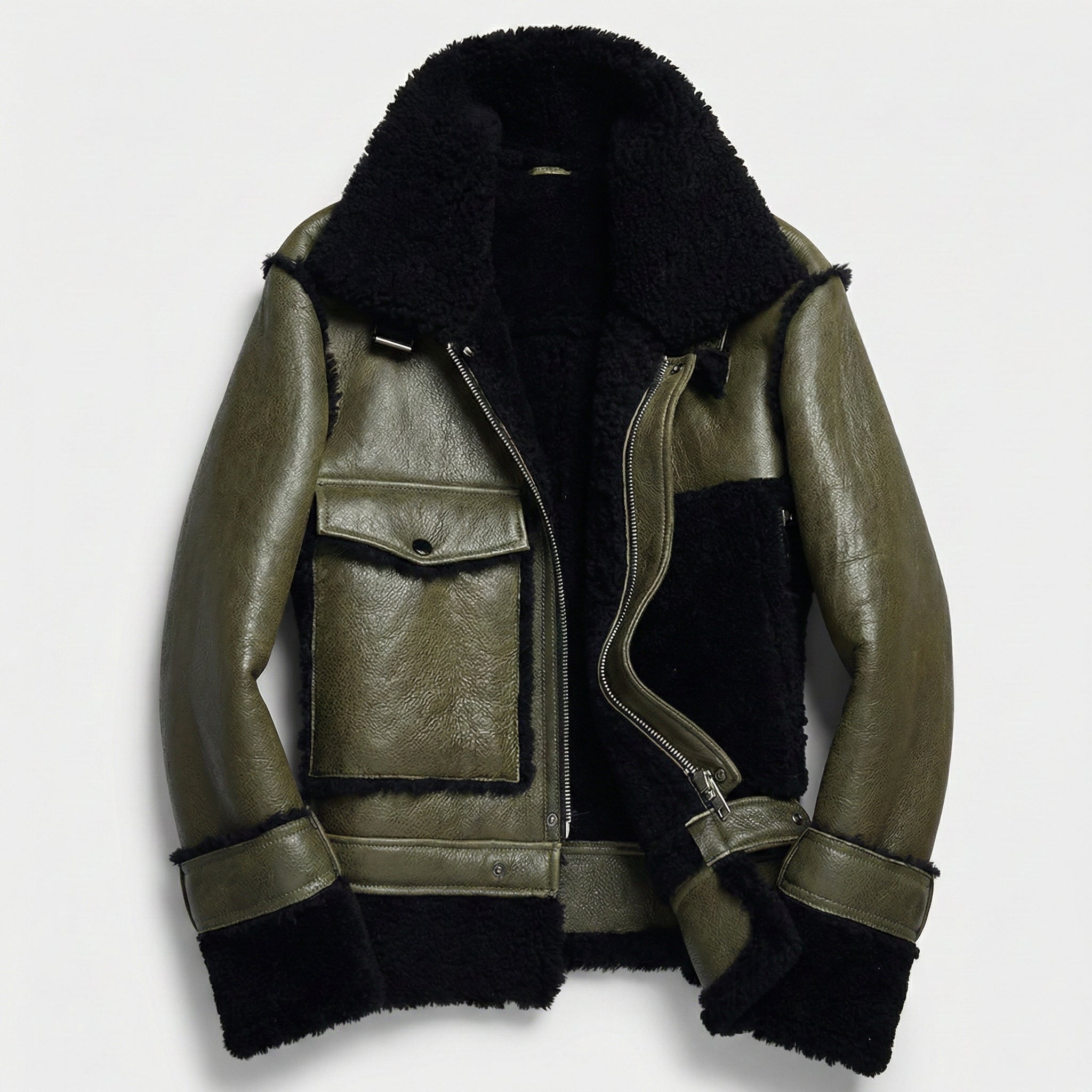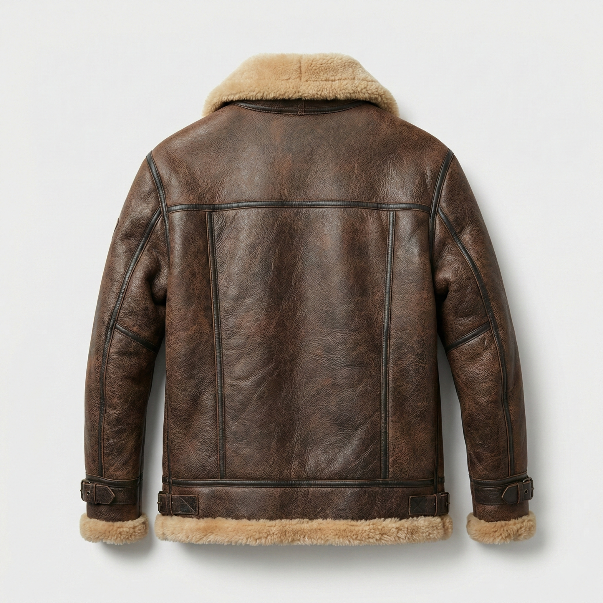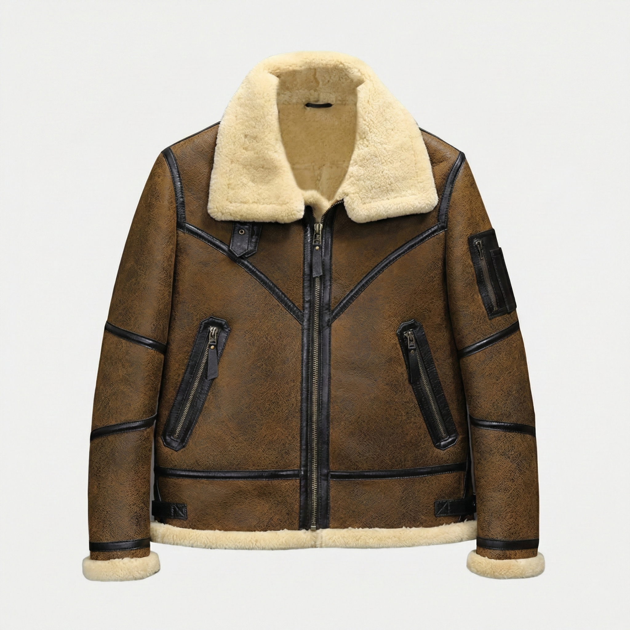 Premium men's shearling jackets in aviator, bomber, biker and classic coat styles. Explore B3 flight jackets, shearling-lined leather bombers, motorcycle-inspired designs, long shearling coats and vintage aviator styles. Each jacket features genuine sheepskin leather exterior, natural shearling fur lining and authentic details like buckled collars, zippered pockets and belted waists for ultimate warmth and timeless style.