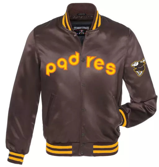 Display your San Diego Padres pride with this stylish brown full-snap Letterman Varsity Jacket. Made from high-quality wool, this jacket is designed for both comfort and durability. Featuring embroidered Padres logos, it provides an authentic fan experience, perfect for any Padres supporter looking to add a sporty edge to their wardrobe.