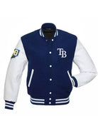 Show off your love for the Tampa Bay Rays with this classic Varsity Jacket. Featuring a sleek blue and white wool body with genuine leather sleeves, this jacket combines sporty style and premium quality. It's the perfect way to represent your team while staying comfortable and on-trend.