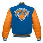 Crafted for both comfort and durability, the jacket’s soft wool body offers warmth, while the genuine leather sleeves provide a premium finish. Ribbed cuffs and collar ensure a snug, comfortable fit, perfect for cooler weather. The blue and orange color combination makes it easy to pair with a variety of outfits, making this varsity jacket a versatile addition to any Knicks fan's wardrobe.