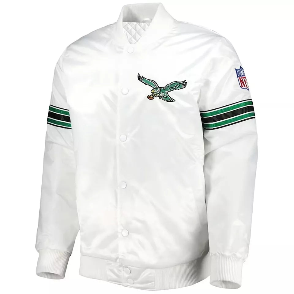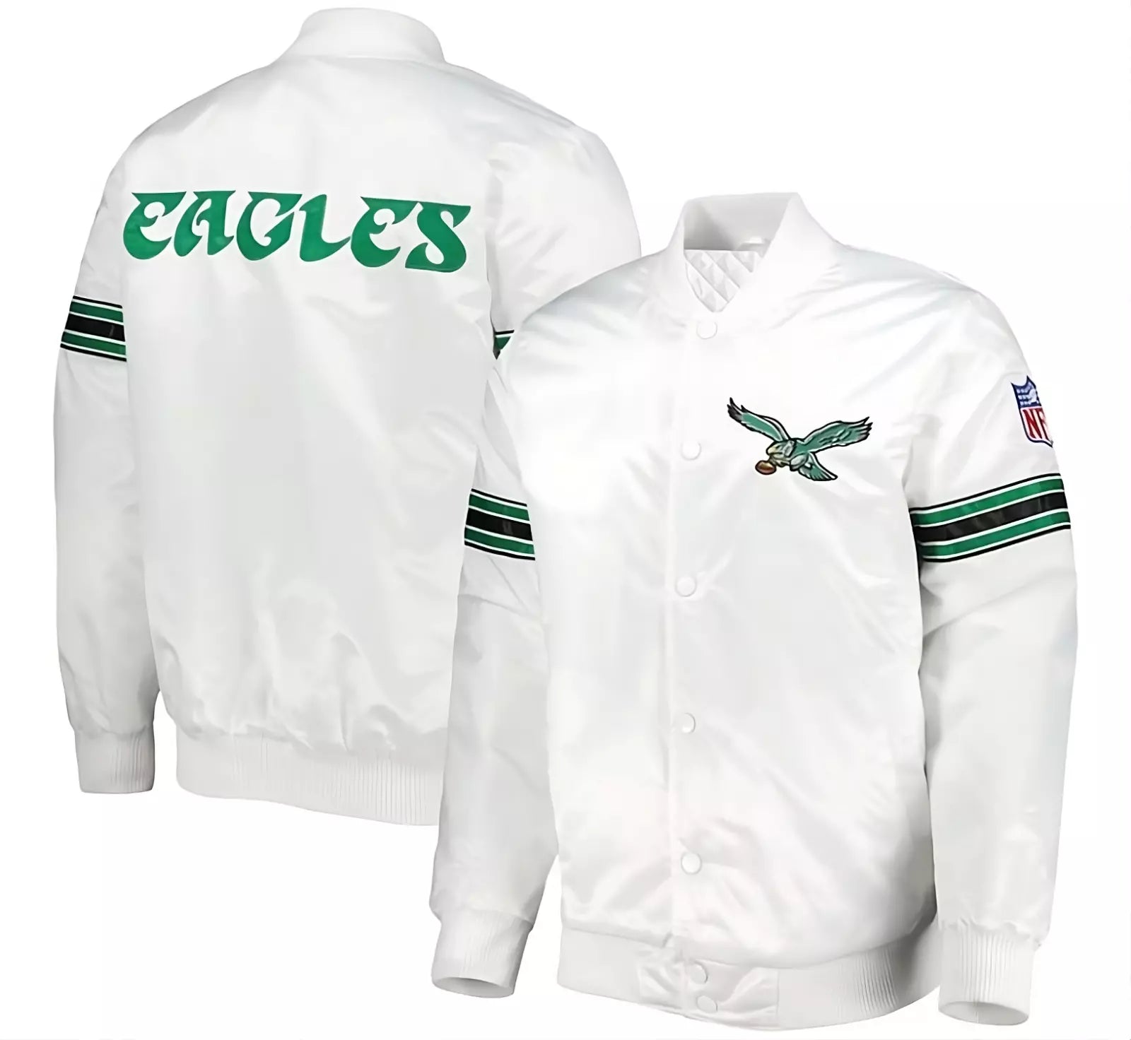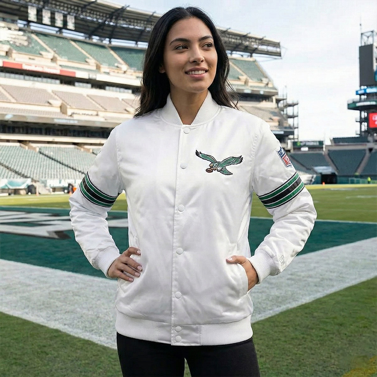 Philadelphia Eagles Full Snap White Satin Varsity Jacket Embroidery logos - NFL