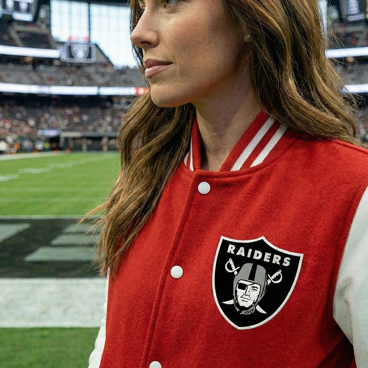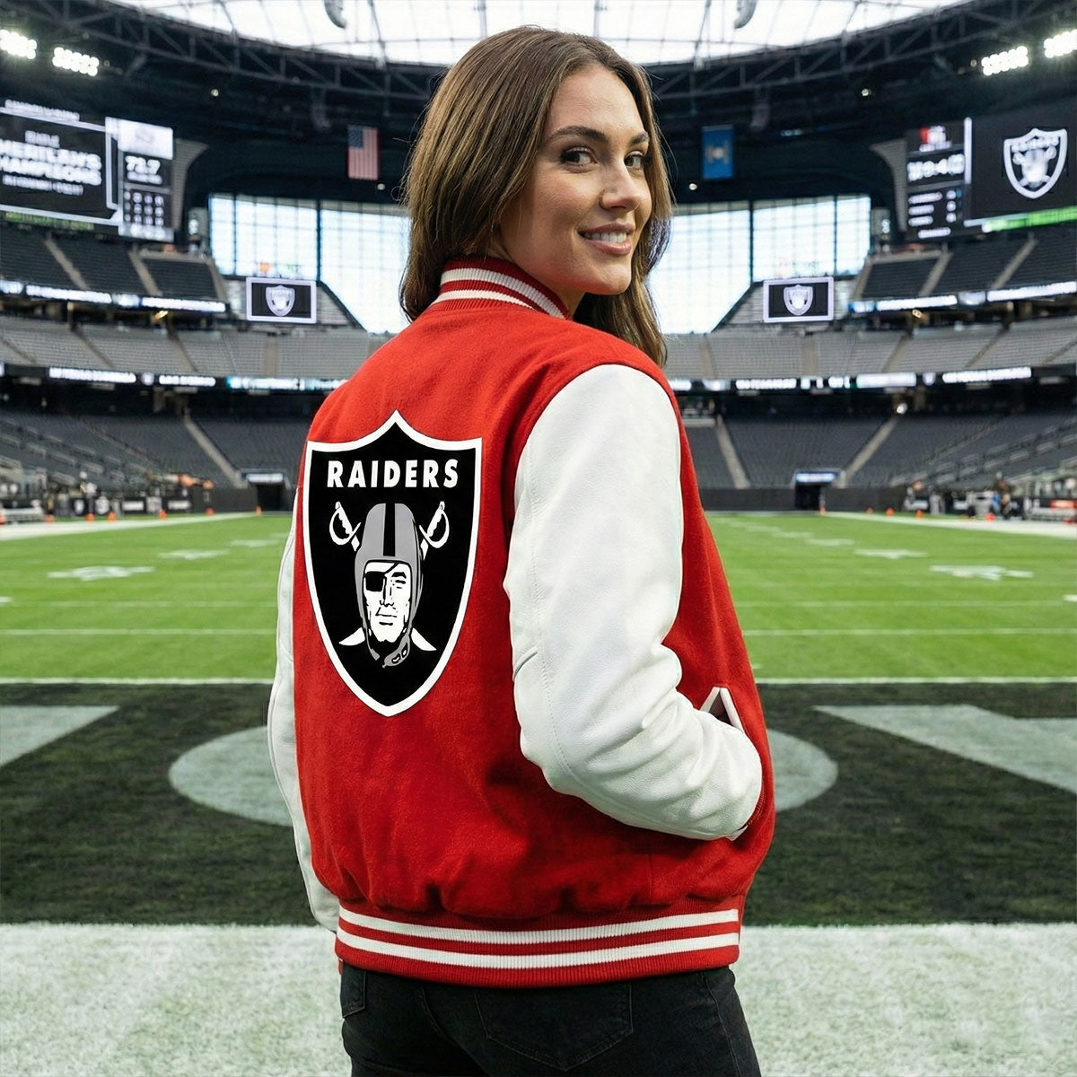 Oakland Las Vegas Raiders Letterman varsity jacket wool body leather sleeves red and white - NFL