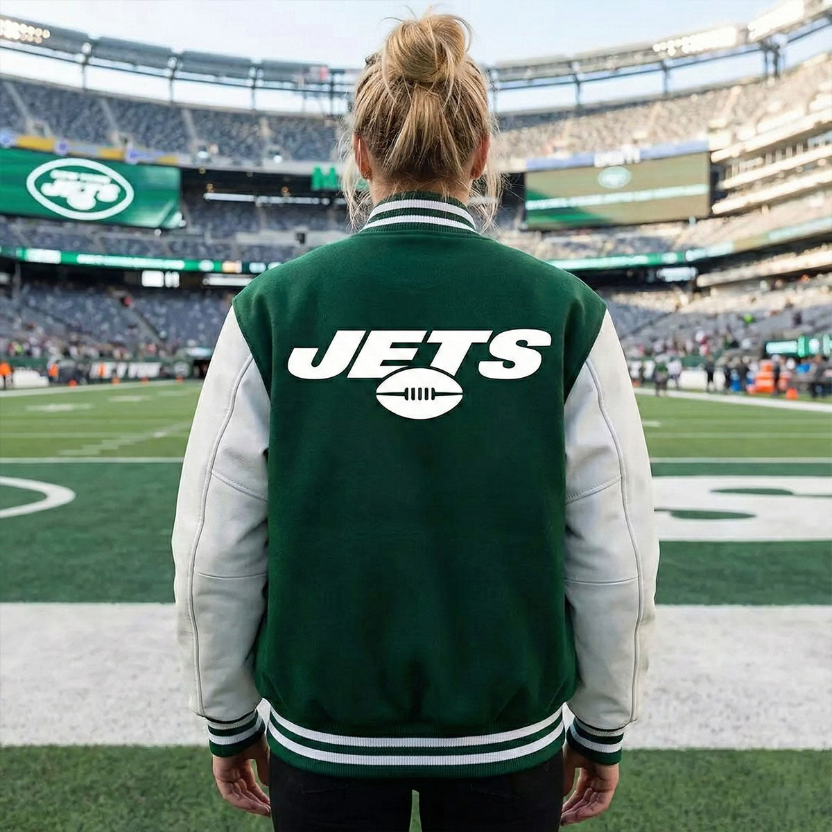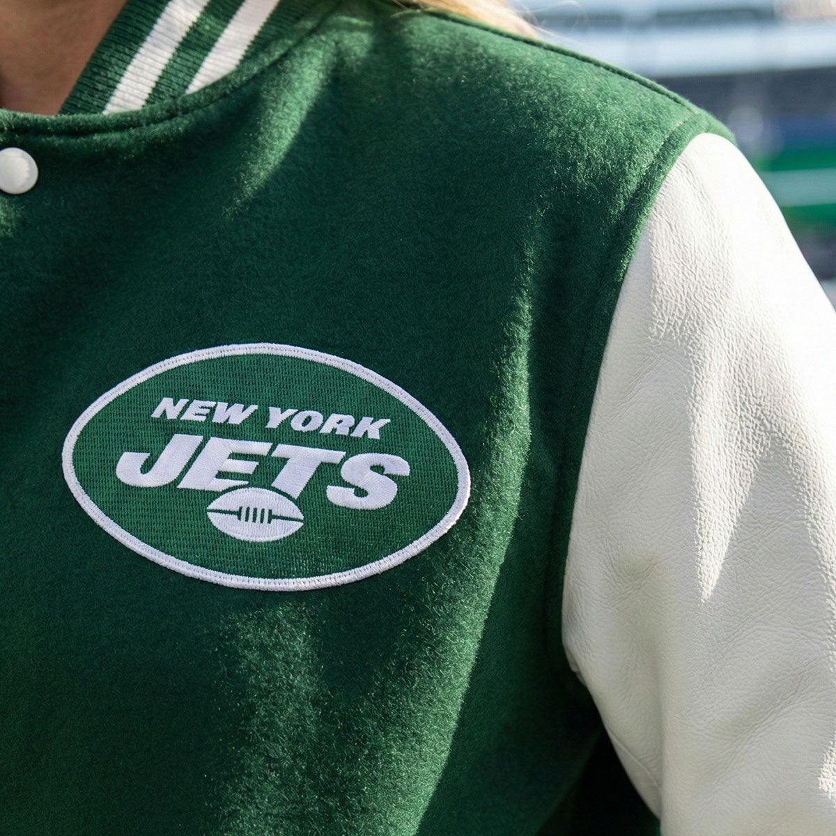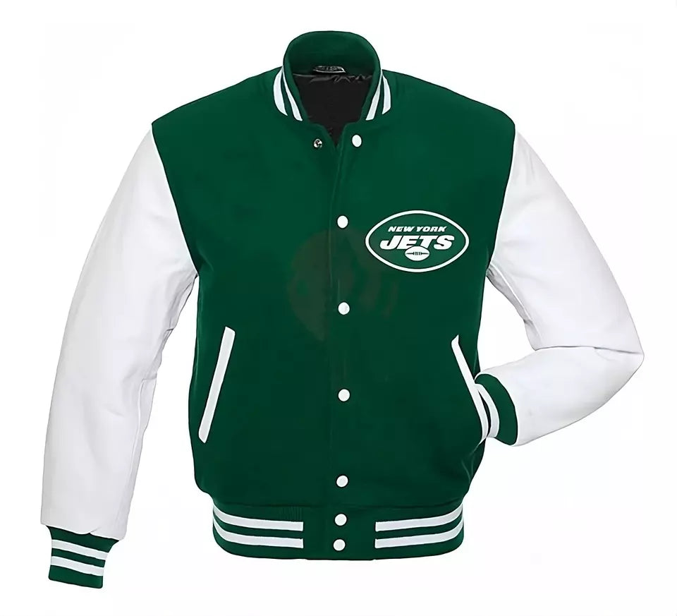 New York NY JETS Letterman Varsity Jacket Wool with Genuine Leather Sleeves green and white - NFL