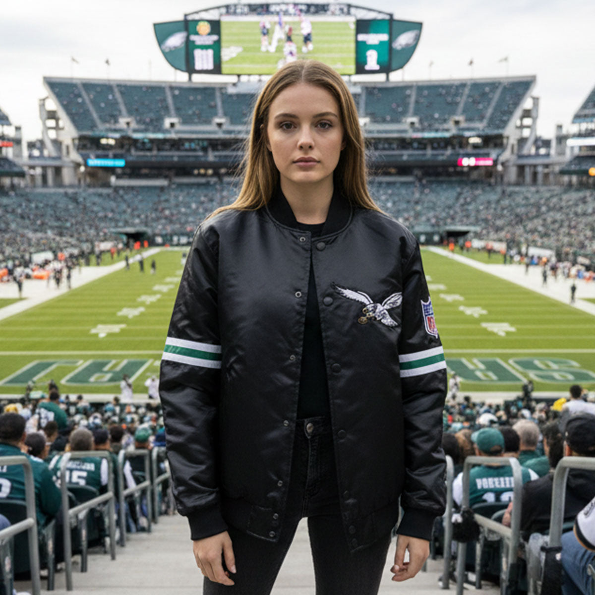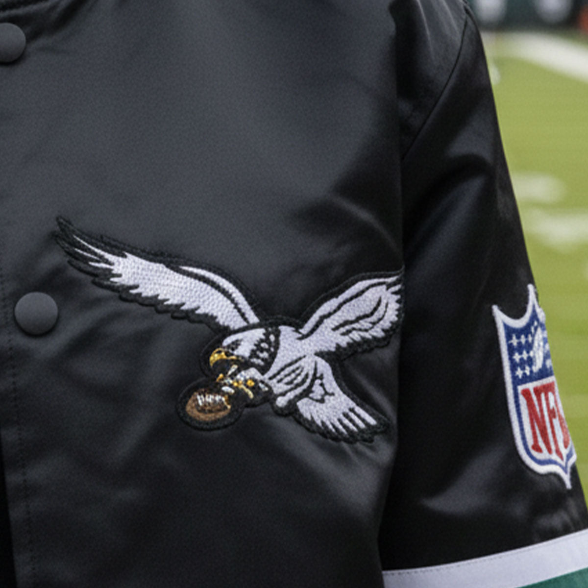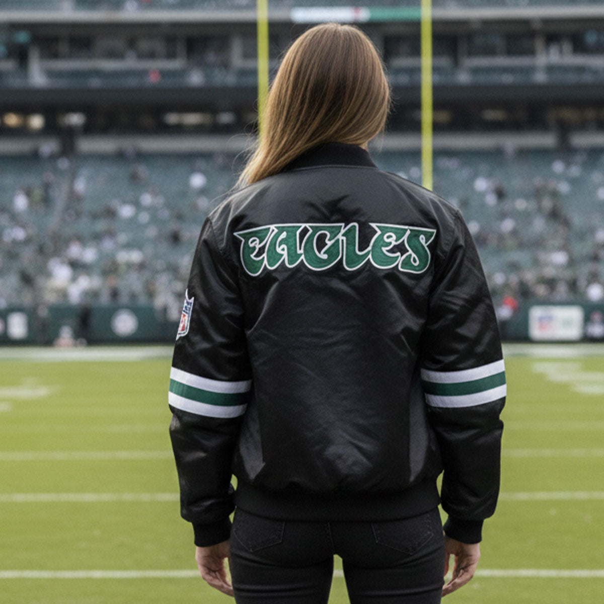 Philadelphia Eagles Black Full Snap Satin Varsity Jacket Embroidery logos black - NFL