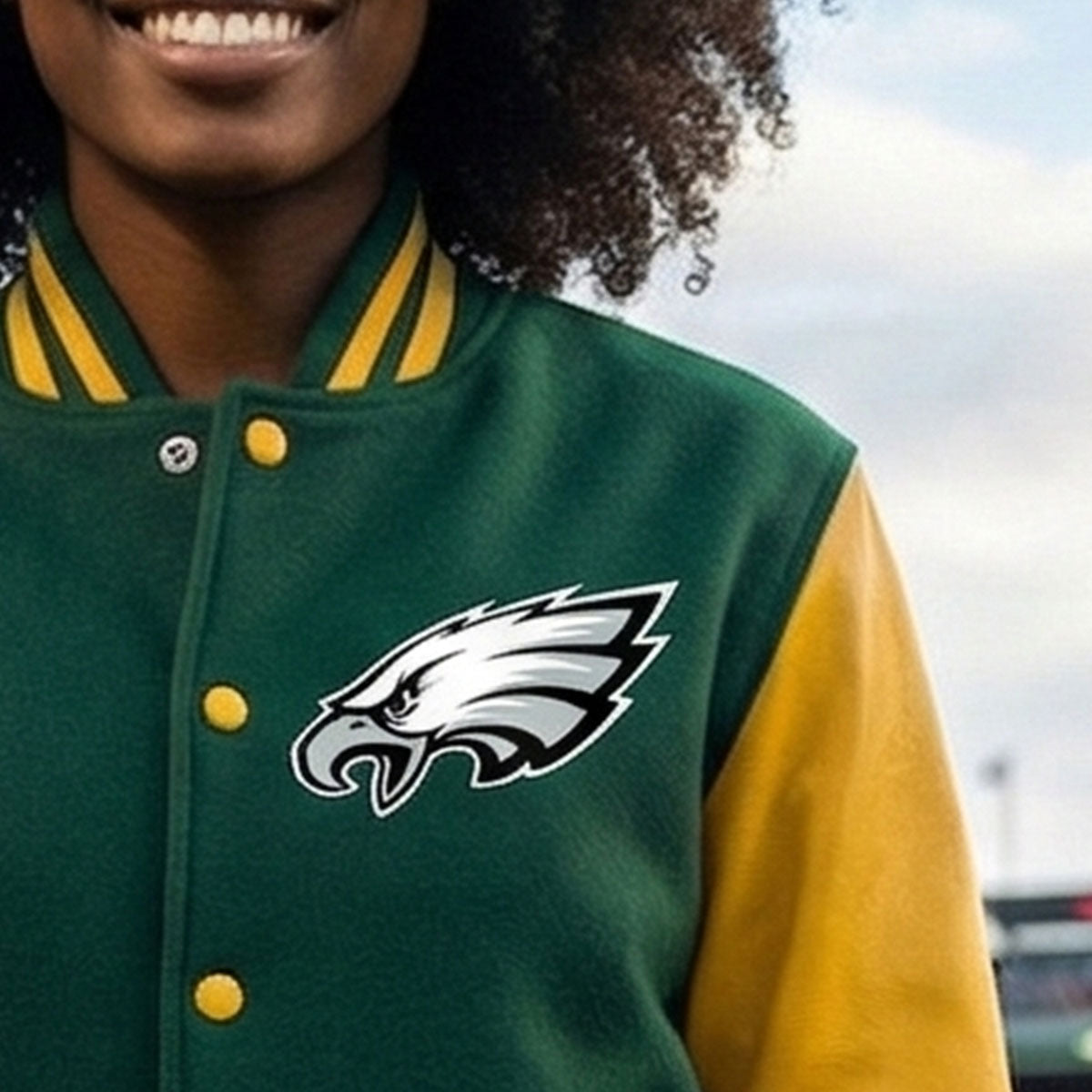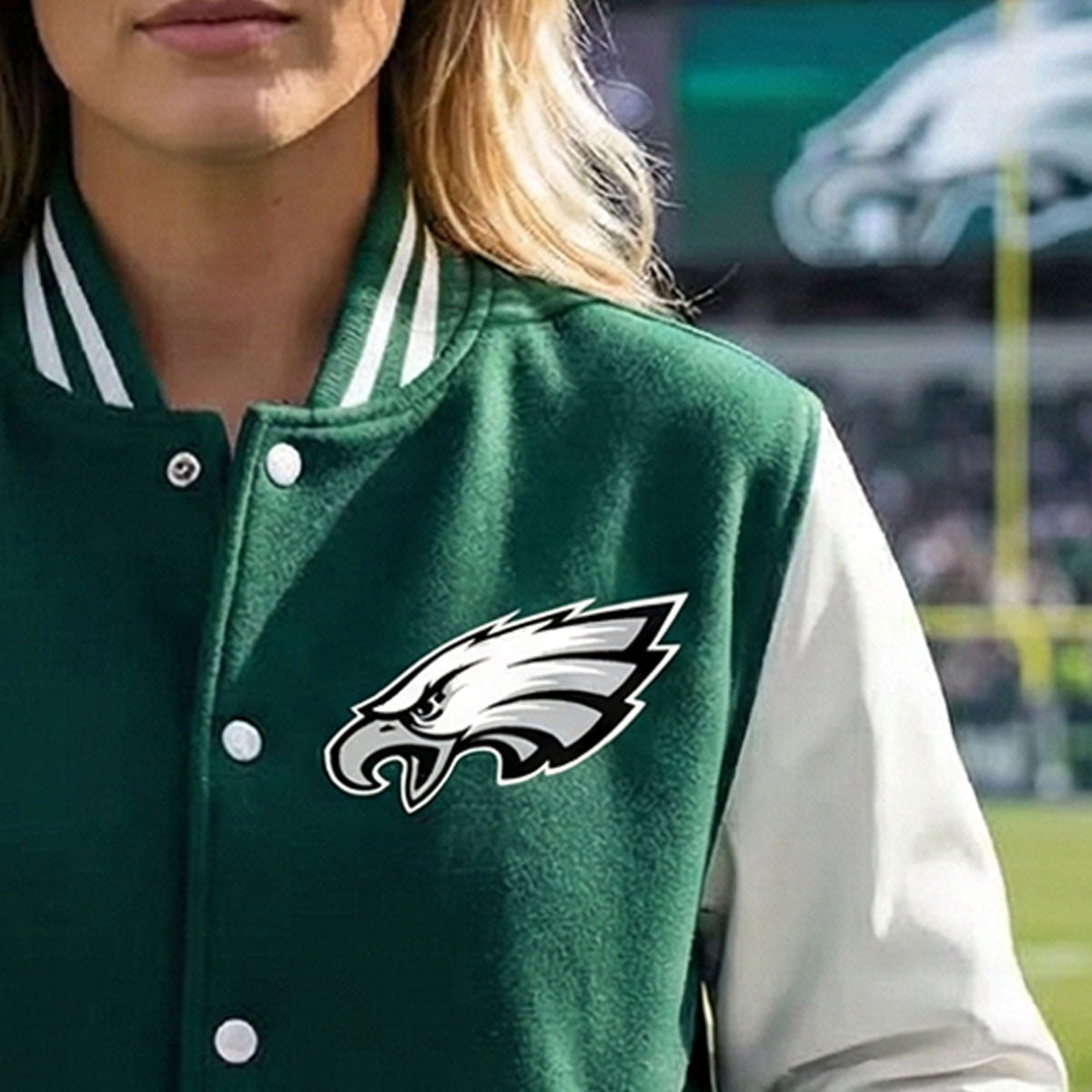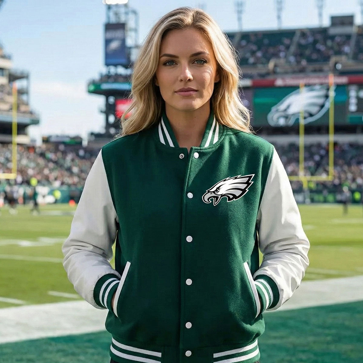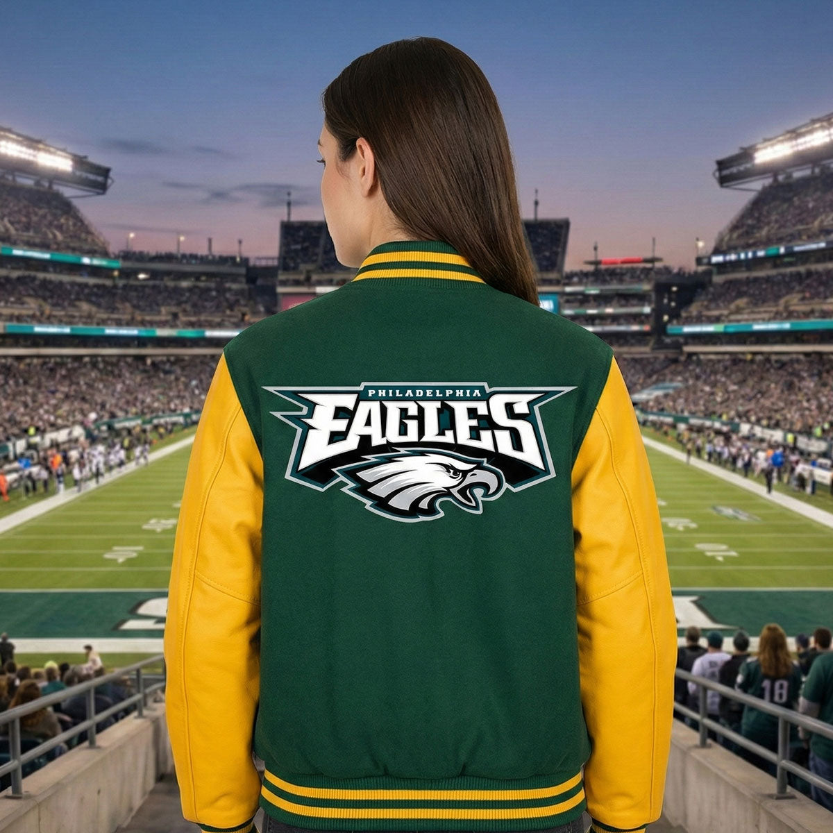 Philadelphia Eagles Green Wool Letterman Varsity Jacket With Real Leather Sleeves -NFL