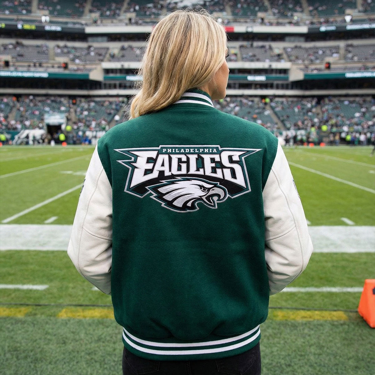 Philadelphia Eagles Green Letterman Varsity Jacket Green Wool & White Leather - NFL