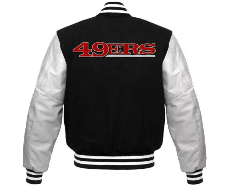 San Francisco 49ers Black & White Letterman Varsity Jacket with Leather Sleeves - NFL