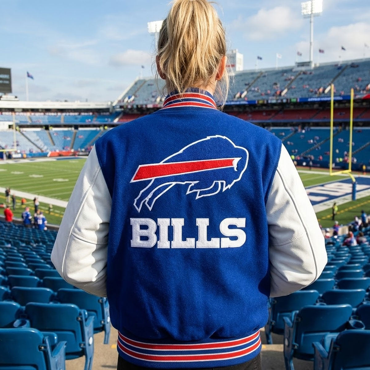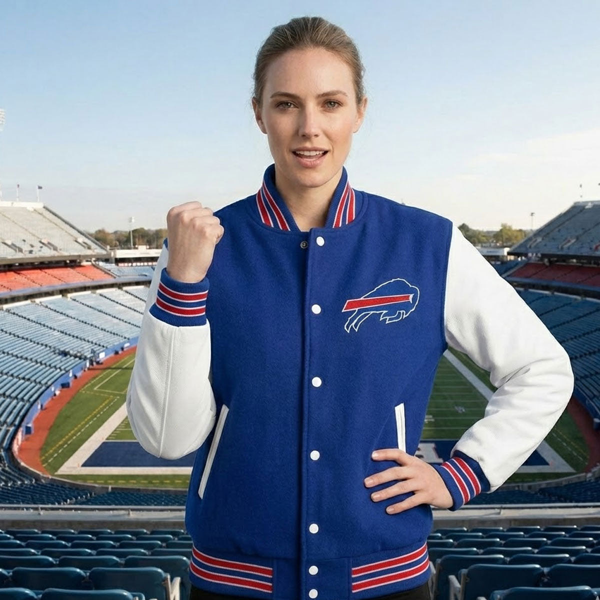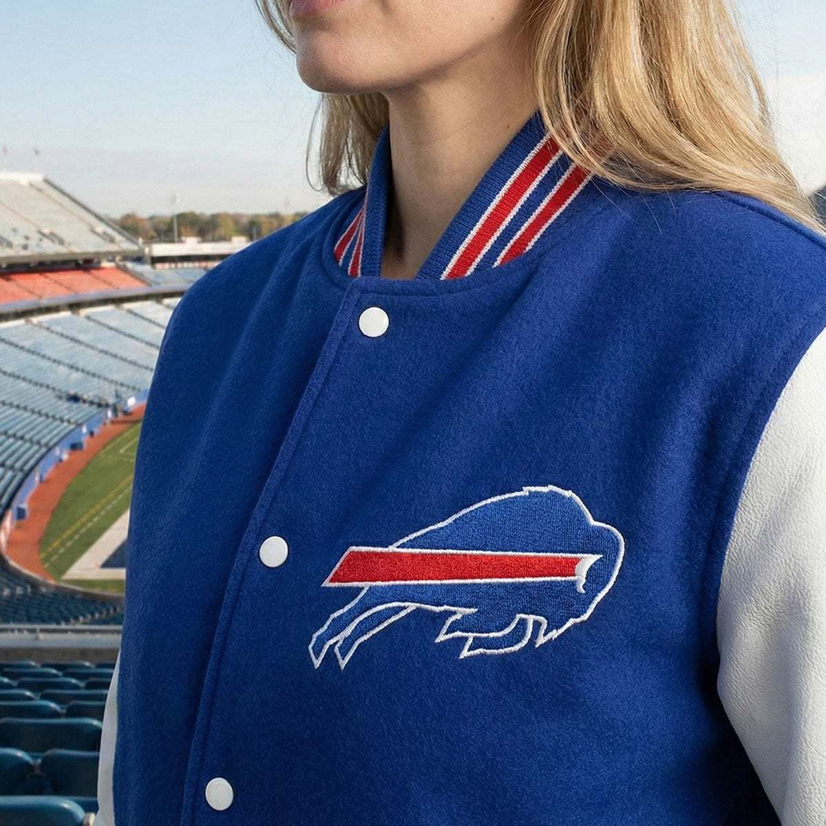 Whether you're tailgating at Highmark Stadium or representing your team around town, this varsity jacket delivers heritage style with modern comfort. The combination of blue wool and white genuine leather creates a premium piece that stands out in any Bills fan's collection.