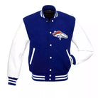 Showcase your Denver Broncos pride with this classic blue and white Letterman Varsity Jacket. Crafted from premium wool and featuring genuine leather sleeves, this jacket combines comfort, durability, and style. Whether you're at the game or out on the town, it's the perfect way to represent your team.