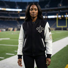 Celebrate your Saints pride with this premium women's varsity jacket that combines timeless letterman style with authentic team spirit. Crafted with a luxurious black wool body and genuine white leather sleeves, this jacket delivers both heritage craftsmanship and a tailored fit designed specifically for women.