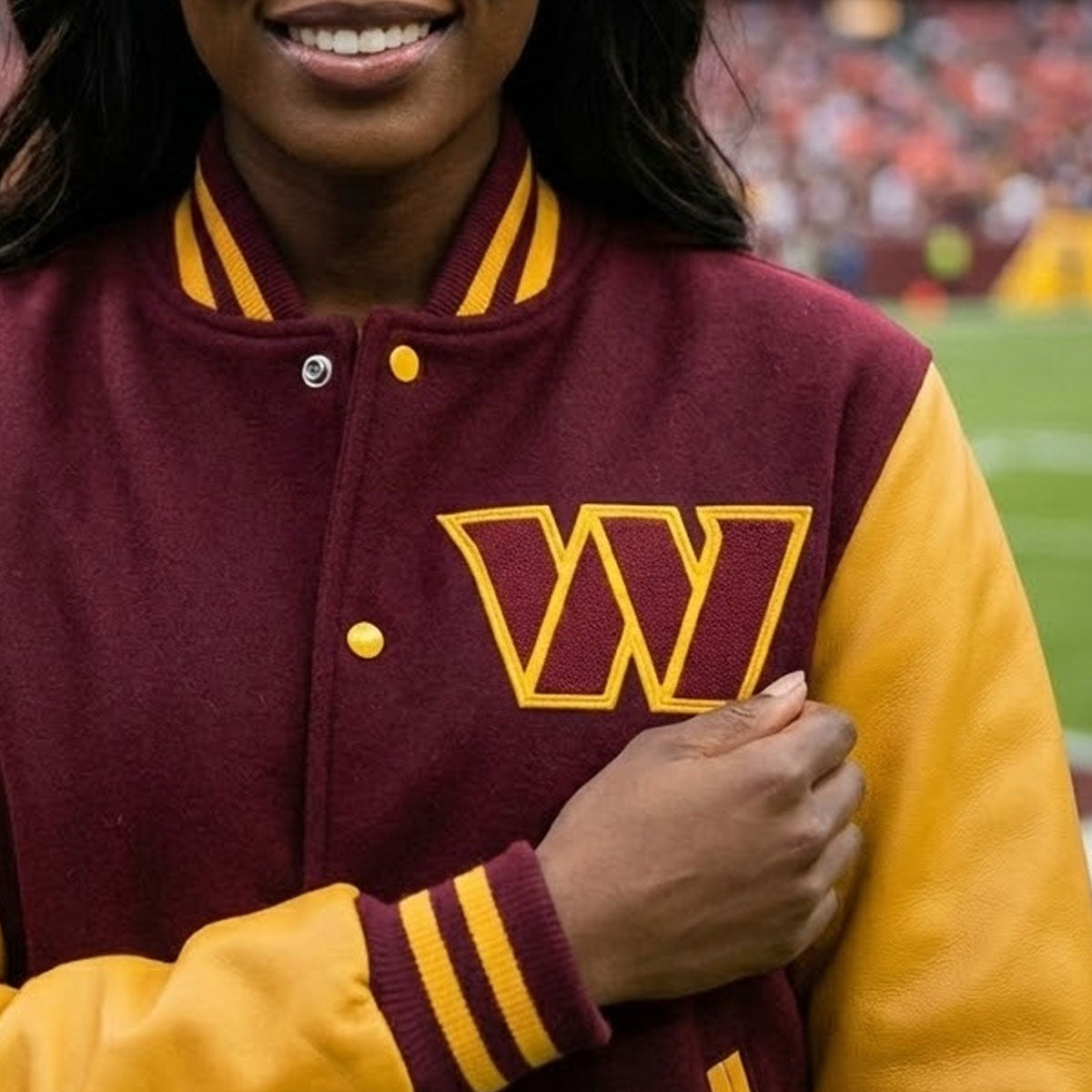 Whether you're cheering from the stands at FedExField or watching the game with friends, this varsity jacket delivers timeless letterman style with authentic team pride. The burgundy wool body paired with gold leather sleeves creates a bold, eye-catching look that celebrates Commanders tradition.