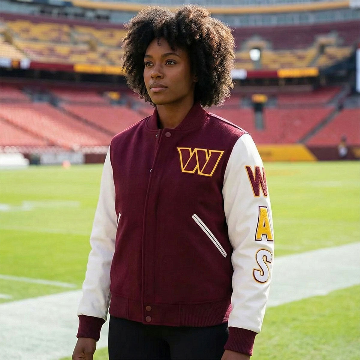 Whether you're at FedExField or watching from home, this varsity jacket delivers timeless letterman style with authentic team spirit. The burgundy wool body and white leather sleeves create a bold contrast that turns heads, while premium materials ensure this jacket becomes a wardrobe staple for seasons to come.