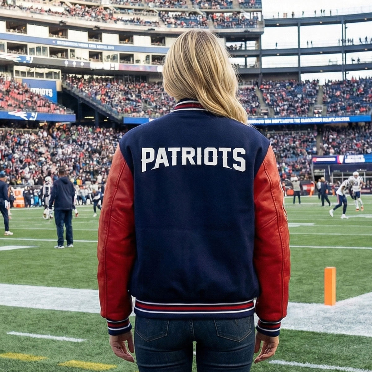 Whether you're cheering from the stands at Gillette Stadium or representing your team around town, this varsity jacket delivers heritage style with modern comfort. The combination of blue wool and red genuine leather creates a premium piece that stands out in any Patriots fan's collection.