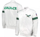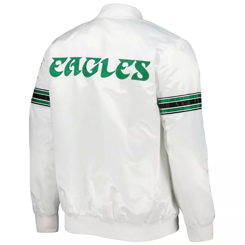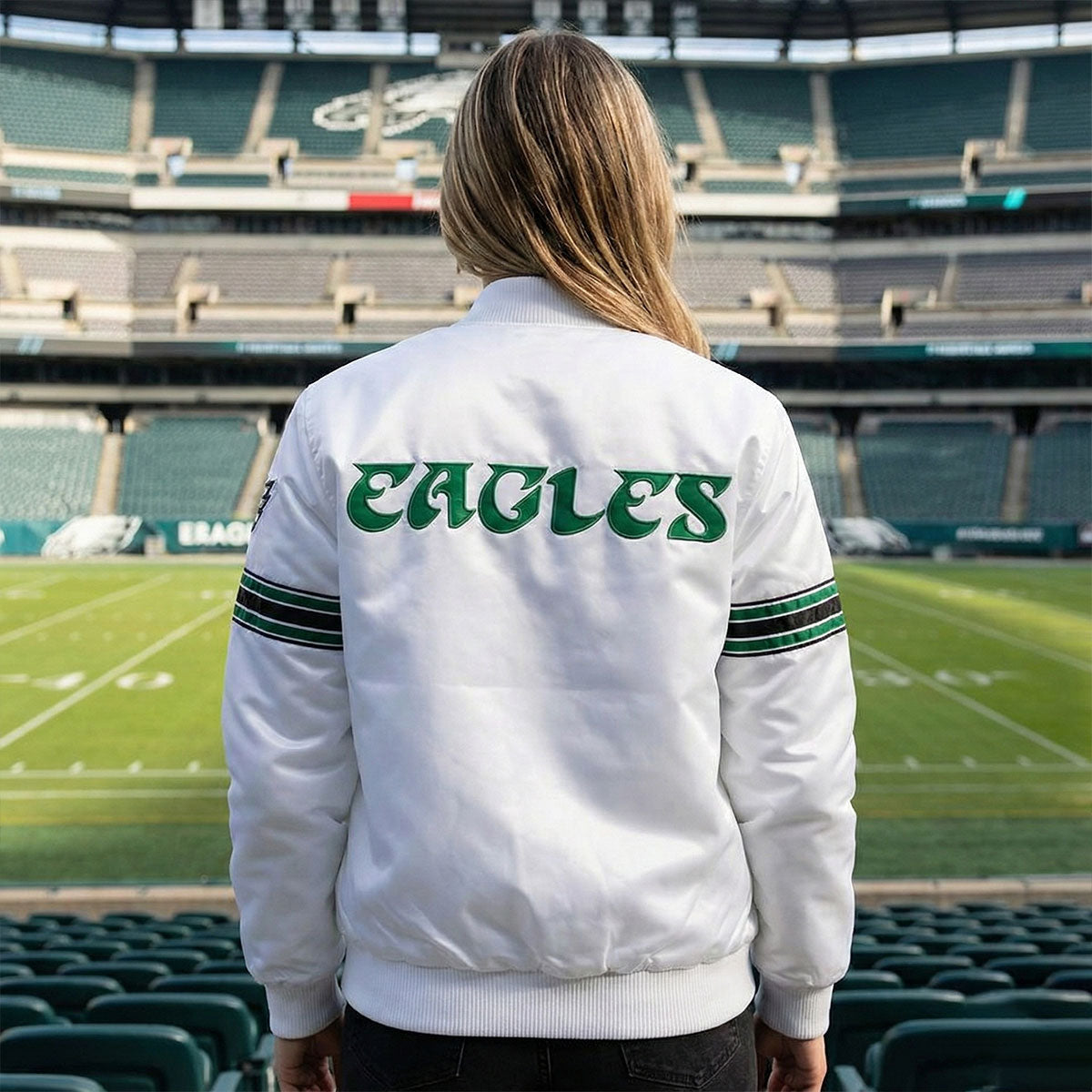 Philadelphia Eagles White Satin Varsity Jacket – Premium NFL Letterman with Embroidered Logos