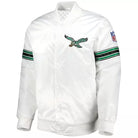 Make a bold statement in Eagles white with this pristine satin varsity jacket featuring embroidered team logos. Designed for fans who want a fresh, standout look with authentic team spirit, this letterman jacket delivers classic NFL style with a clean, modern satin finish.