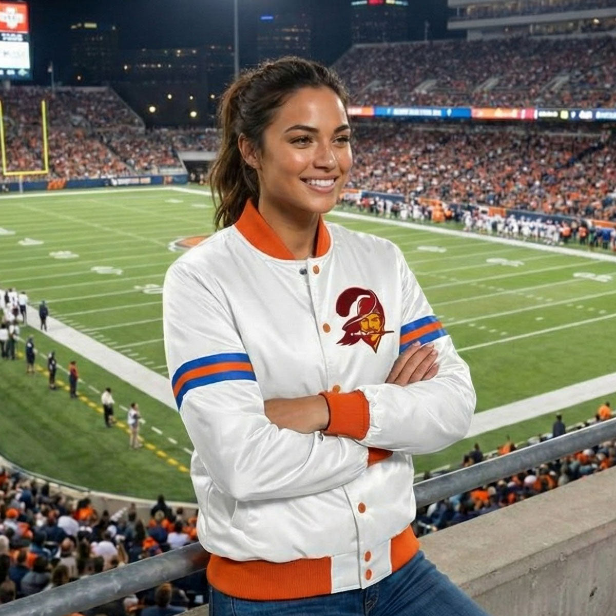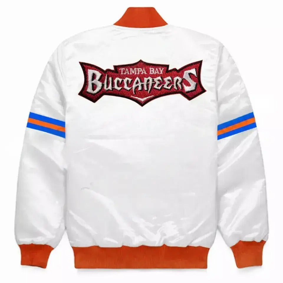 Bring the retro flair of the 80s to your wardrobe with the Tampa Bay Buccaneers Vintage 80s White Satin Bomber Baseball Varsity Jacket. This jacket exudes classic style, with its sleek white satin body and vibrant team colors. A tribute to the Buccaneers’ golden years, it blends bold nostalgia with modern comfort, making it a must-have for any fan.