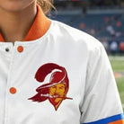 With the iconic Buccaneers logo embroidered on the chest, this jacket features a baseball-inspired varsity design. The ribbed cuffs, collar, and waistband give it a traditional look, while the satin finish keeps it looking fresh and stylish. Perfect for gamedays or casual outings, this jacket will have you showcasing your team spirit in high style.