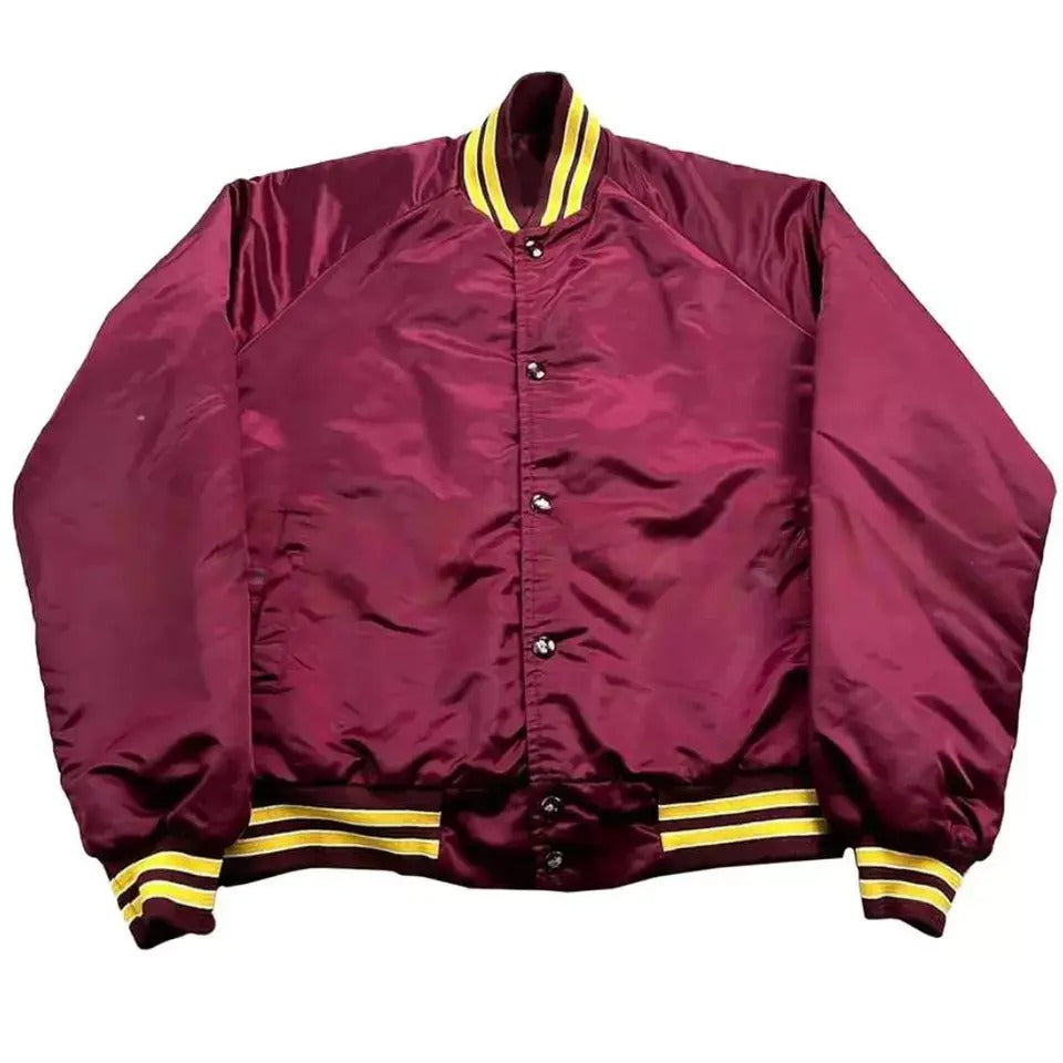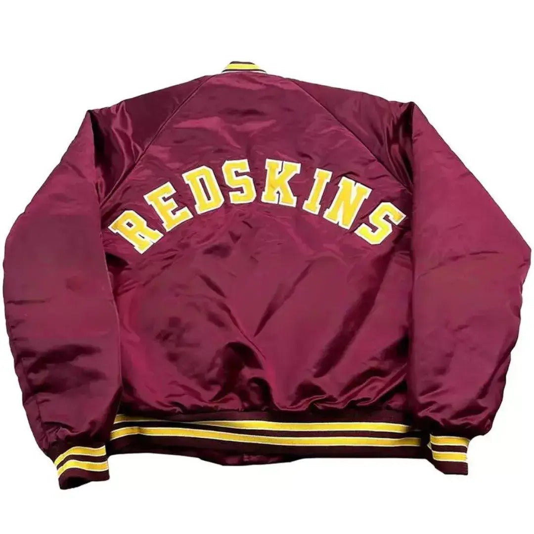 Step back in time with the Washington Redskins 1990's Vintage Style Maroon Satin Varsity Jacket. This jacket brings back the iconic look from the '90s with its rich maroon satin body and sharp contrast of bold colors. Perfect for showing off your Redskins pride, it captures the spirit of the team’s golden era while offering modern comfort and style.