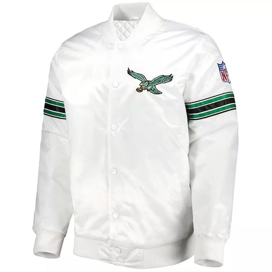 Step up your game-day style with the Philadelphia Eagles Full Snap White Satin Varsity Jacket....