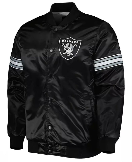 Stay sleek while repping your team with the Las Vegas Raiders Black Satin Varsity Jacket....