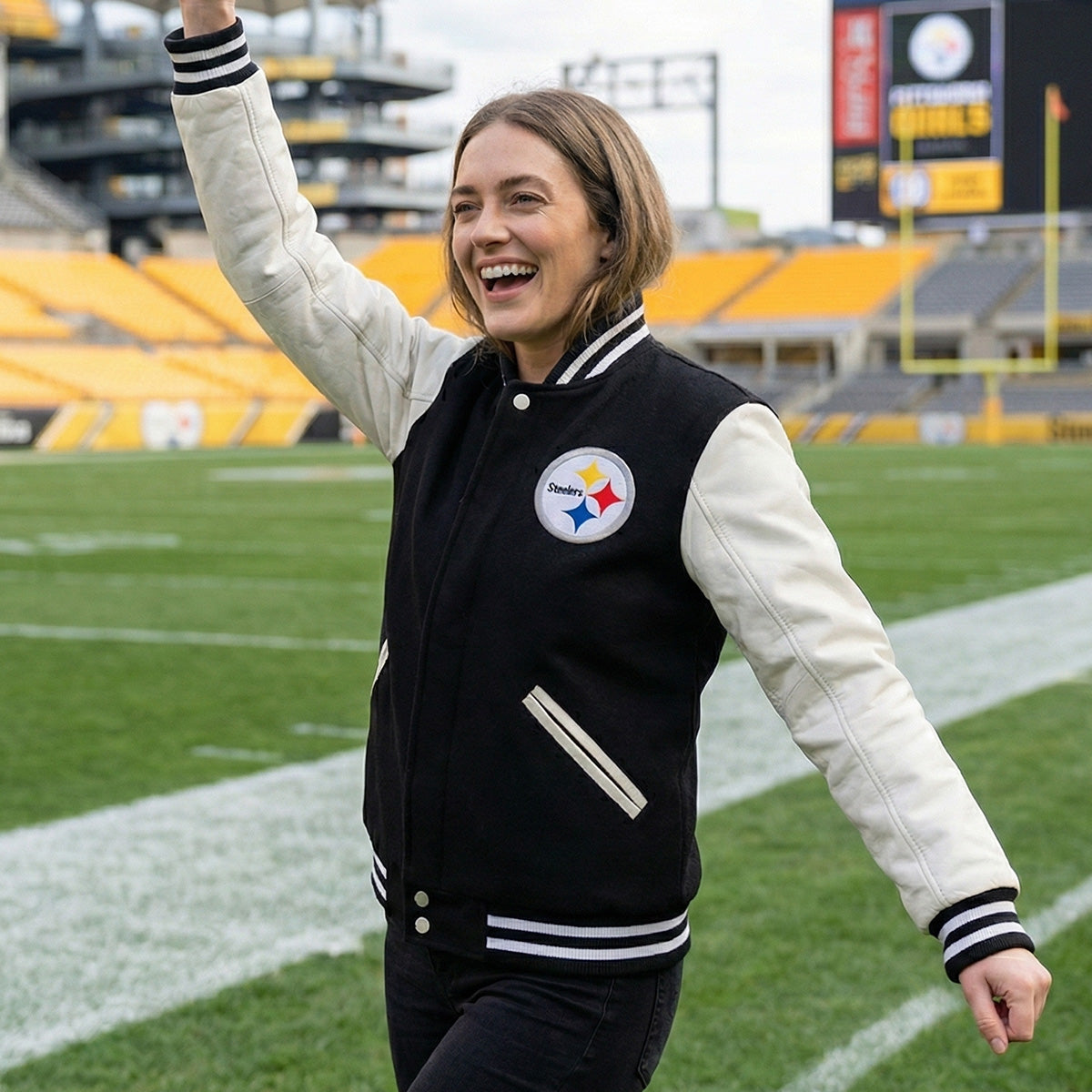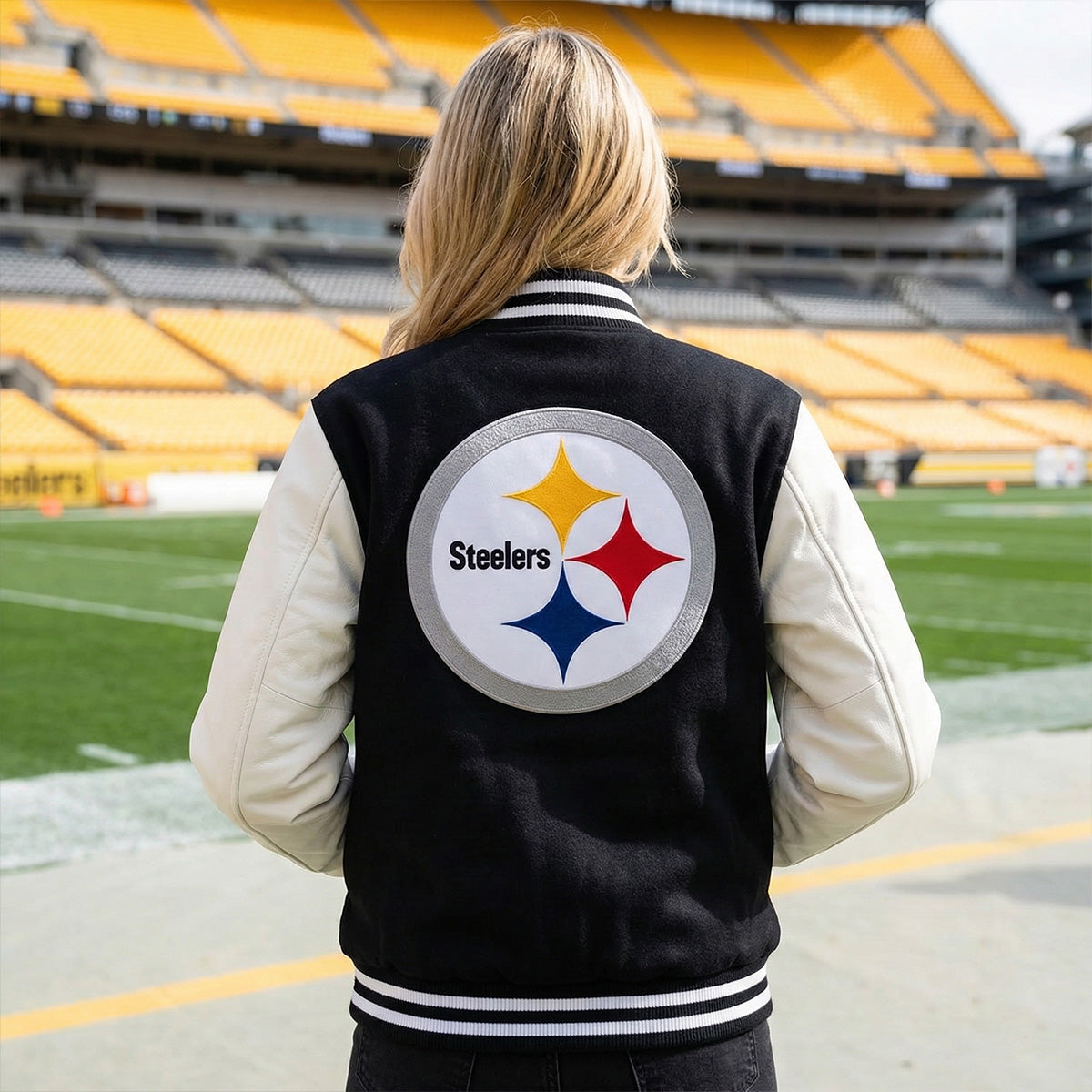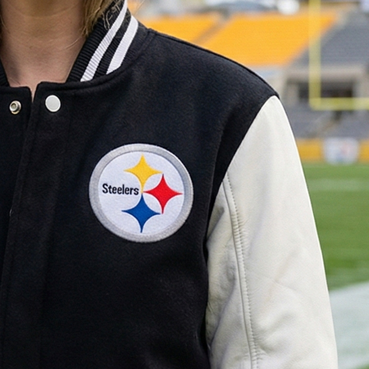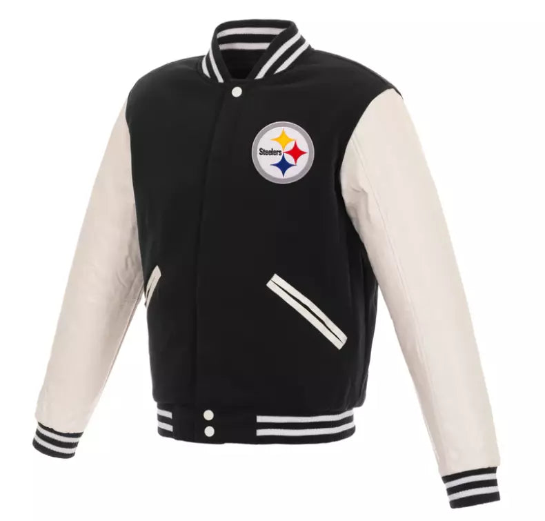 Letterman Pittsburgh Steelers Varsity Jacket Wool with Real Leather Sleeves -NFL black and white