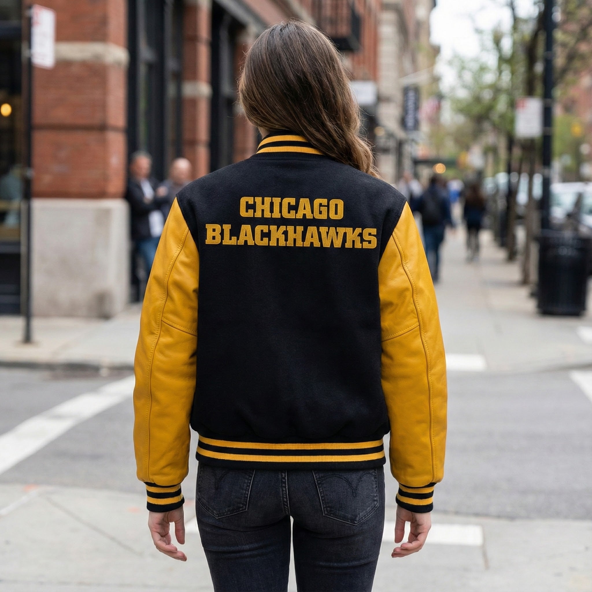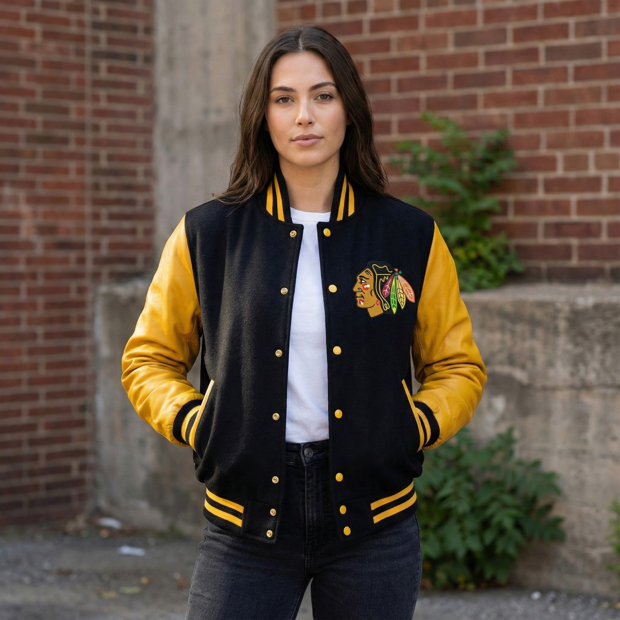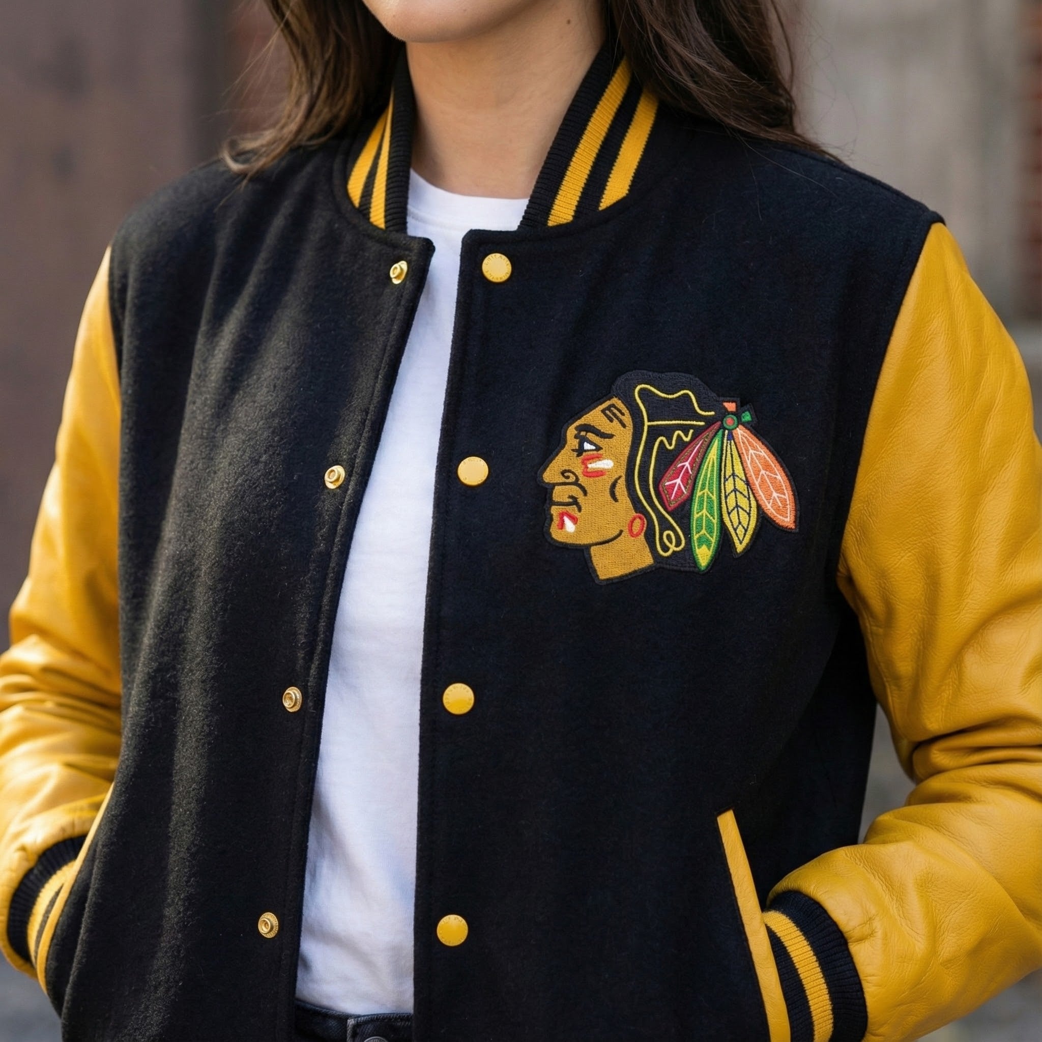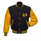 Represent the Chicago Blackhawks in style with this premium varsity jacket, featuring a wool body and genuine leather sleeves. The striking black and yellow color combination showcases your team pride while offering a sharp, sophisticated look. With an embroidered Blackhawks logo on the chest, this jacket stands as a bold statement for any fan of the team, blending classic varsity appeal with high-end materials.
