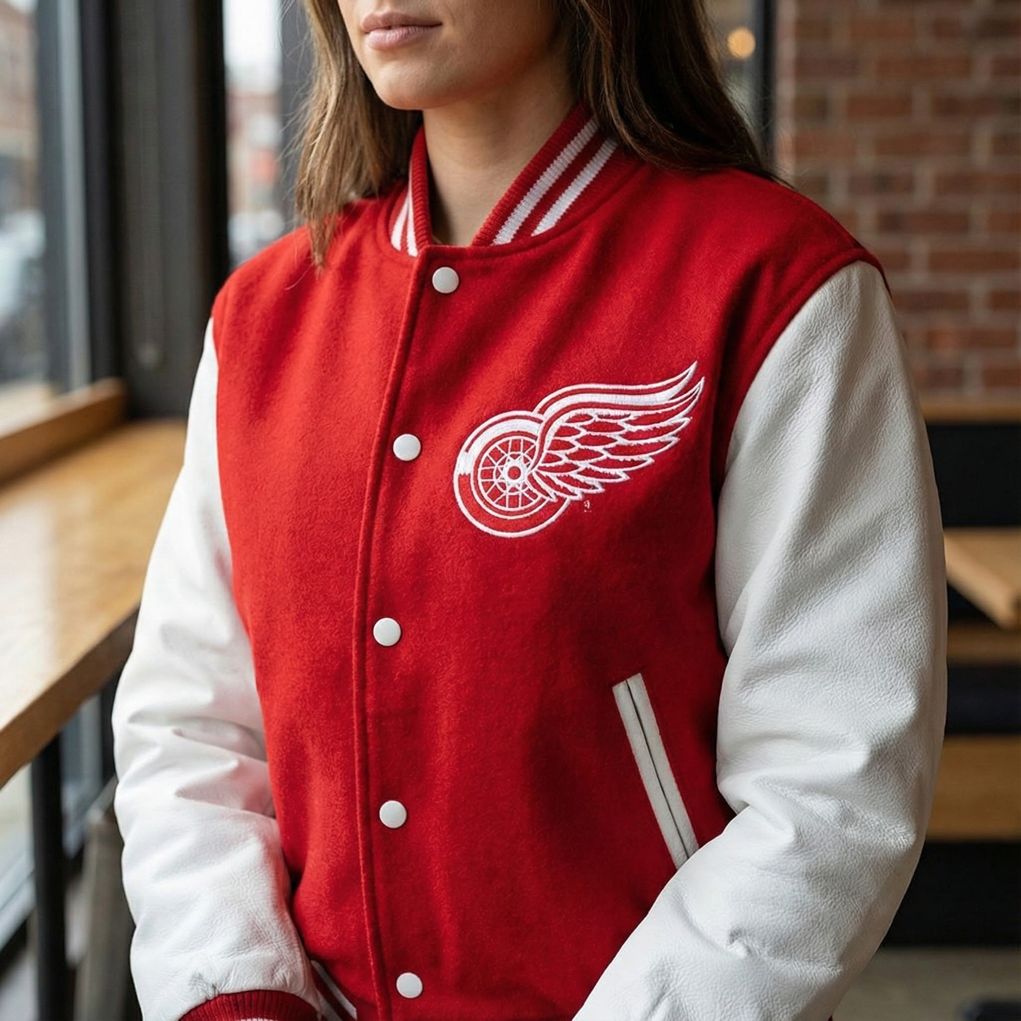 Show off your Detroit Red Wings pride with this premium Letterman varsity jacket. Made from high-quality wool with genuine leather sleeves, this jacket offers a luxurious and durable fit. The striking red and white color combination represents the team's iconic look, while the detailed embroidered logo brings out the true spirit of the Red Wings. Whether you’re at the game or out with friends, this jacket ensures you stand out in style.