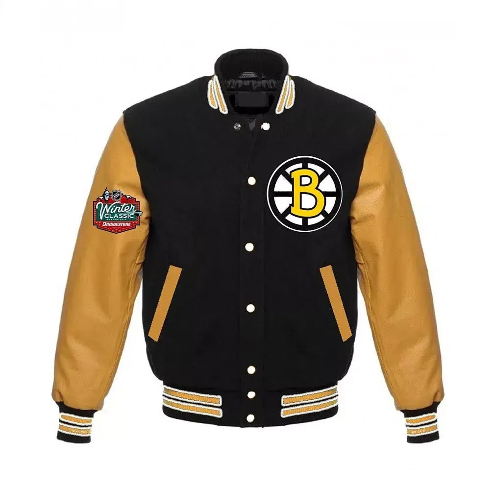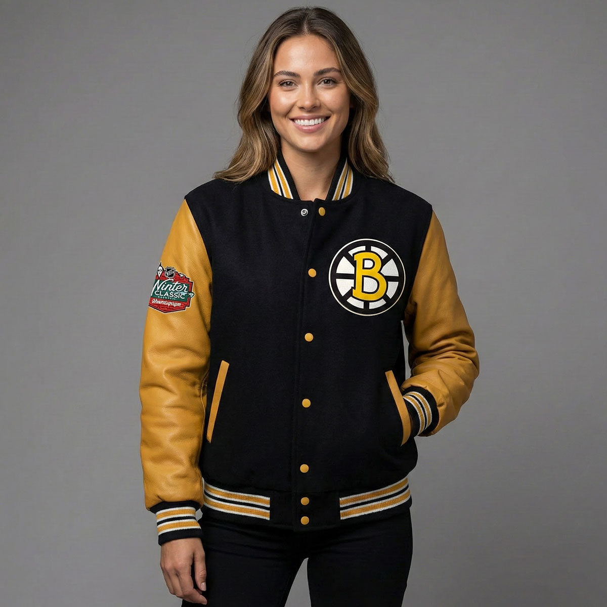 Proudly display your Boston Bruins pride with this stylish black and yellow Letterman varsity jacket. Featuring the team’s iconic color combination, this jacket combines comfort with a bold design that every fan will appreciate. The embroidered Bruins logo adds a layer of authenticity, making it a perfect choice for both game days and casual outings.