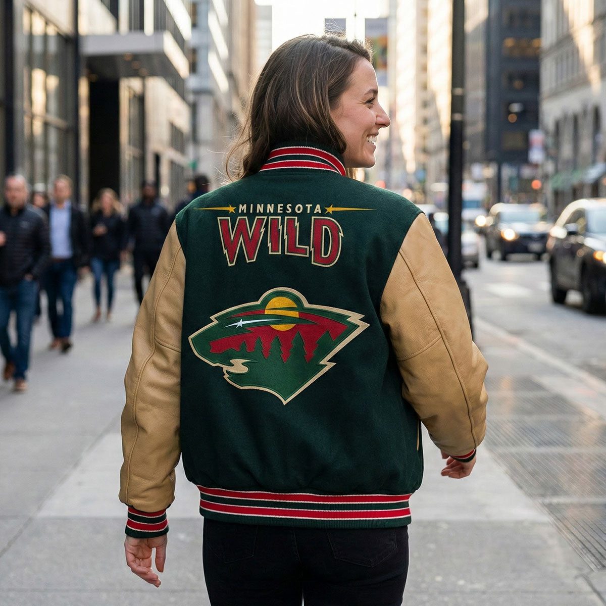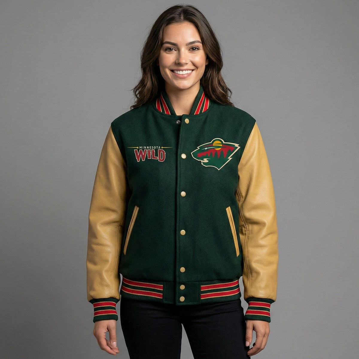 Show your support for the Minnesota Wild with this stylish green and harvest gold Letterman Varsity Jacket. Made with high-quality wool and featuring bold embroidered team logos, this jacket combines comfort and team spirit in one standout piece. The unique green and harvest gold color scheme makes it the perfect choice for fans looking to rep the Wild in style.