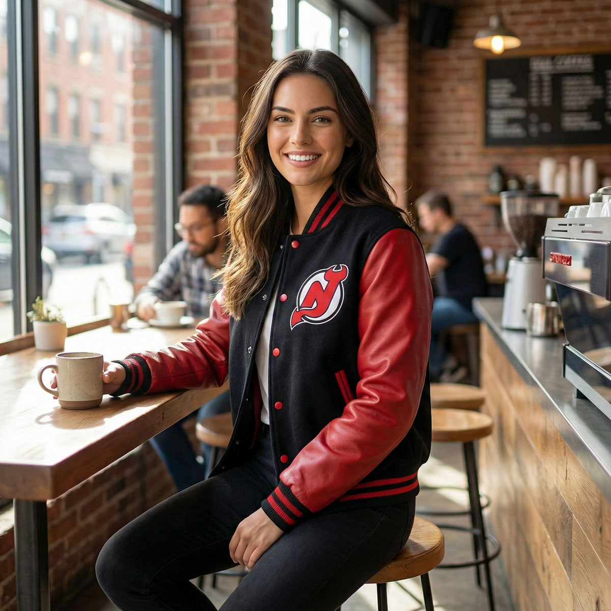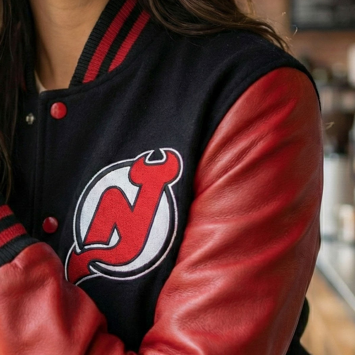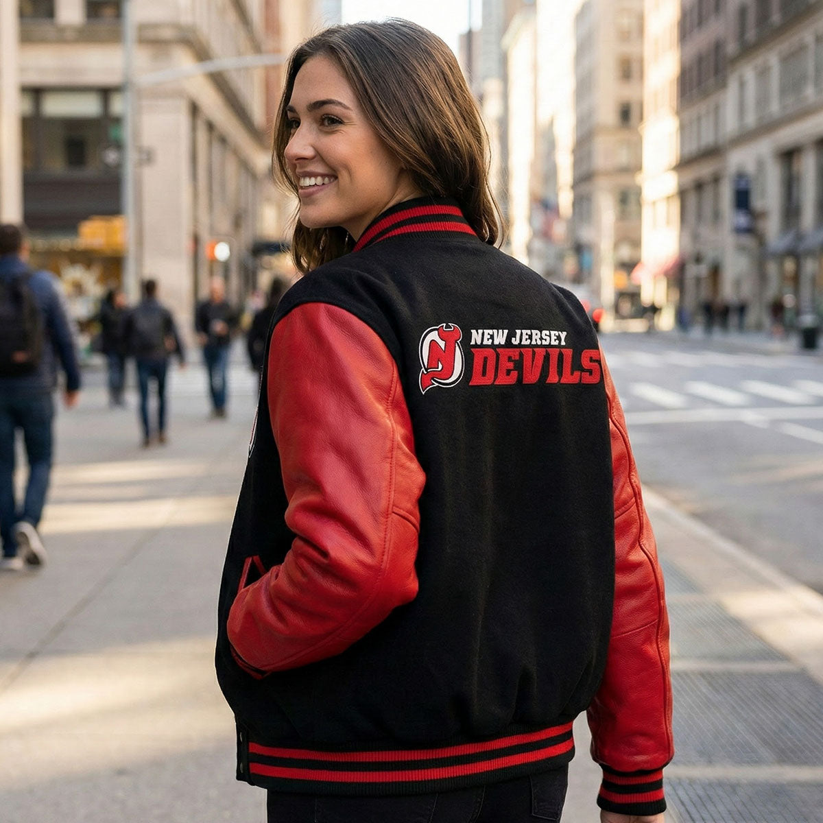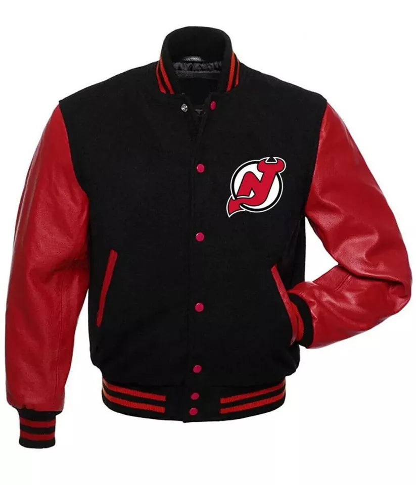 Show off your New Jersey Devils pride with this bold black and red Letterman Varsity Jacket. Featuring premium wool and embroidered team logos, this jacket combines comfort with striking team colors. Whether you're cheering from the stands or wearing it casually, it’s the perfect way to represent your team with style.
