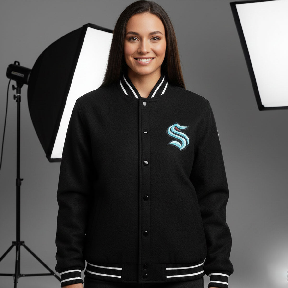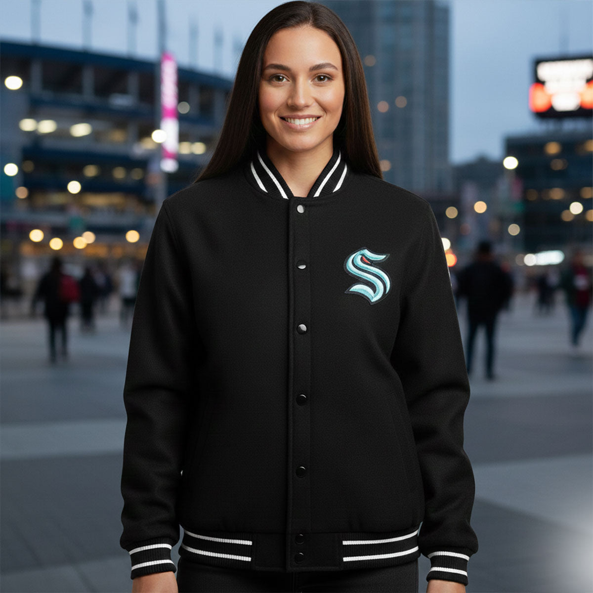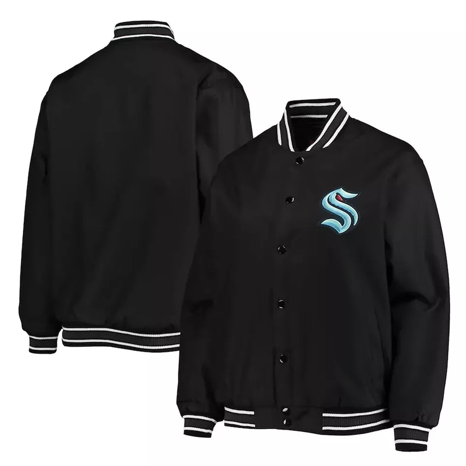 Rep your Seattle Kraken pride with this sharp black wool Letterman Varsity Jacket. Designed for both comfort and style, this jacket features premium wool material and embroidered Kraken logos for a truly authentic look. Perfect for game nights or casual wear, it combines classic varsity appeal with the bold spirit of Seattle's newest NHL team.