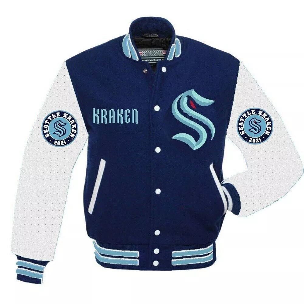 Show your support for the Seattle Kraken in style with this Blue and White Varsity Jacket. Crafted with a wool body and genuine leather sleeves, this jacket combines comfort and durability with a sleek design. The bold blue and white color combination, along with the embroidered Seattle Kraken logo on the chest, makes it a standout piece for any fan.