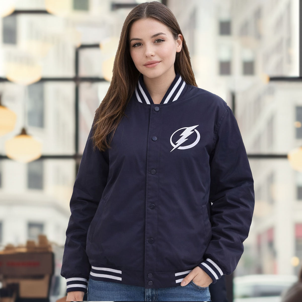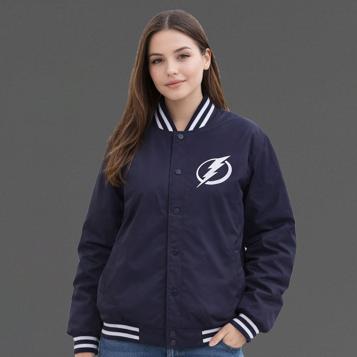 Embroidered Tampa Bay Lightning logos for an authentic fan appearance.