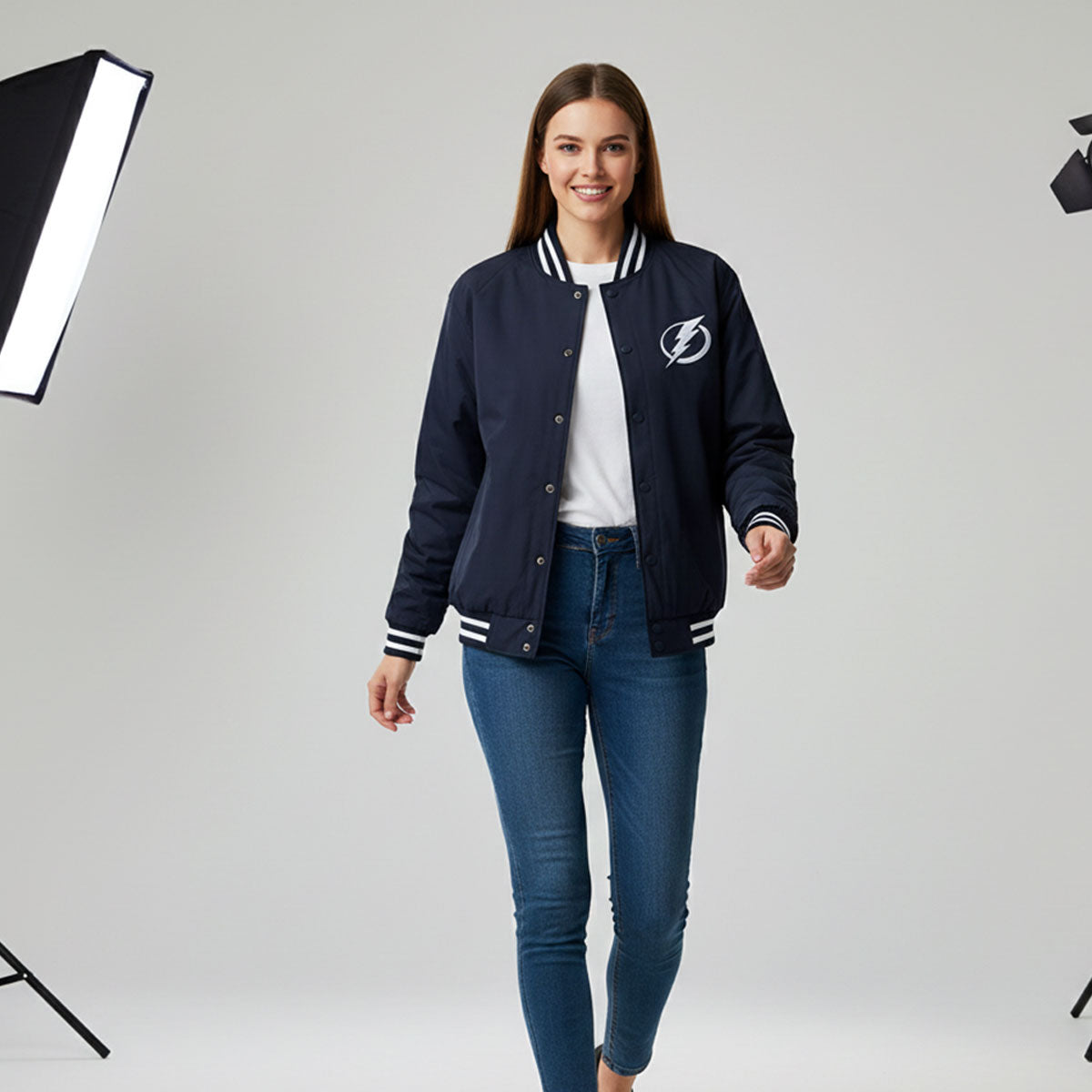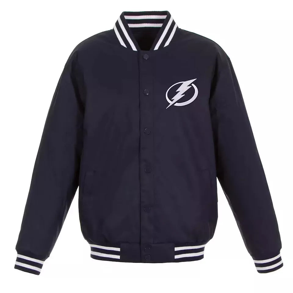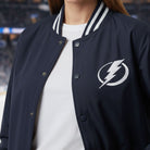 The embroidered Tampa Bay Lightning logo on the chest proudly displays your team loyalty, while the ribbed cuffs, collar, and hem give this jacket a traditional varsity finish. Whether you're watching a game live or cheering from home, this jacket ensures you stay stylish and warm.