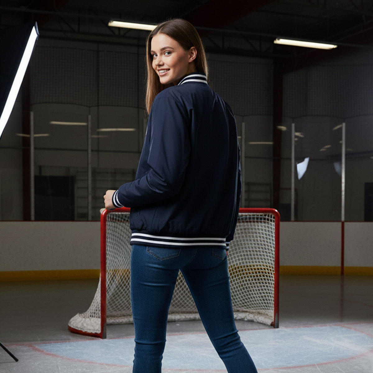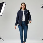 Fit: Varsity-style fit with ribbed cuffs, collar, and hem for a snug, comfortable feel