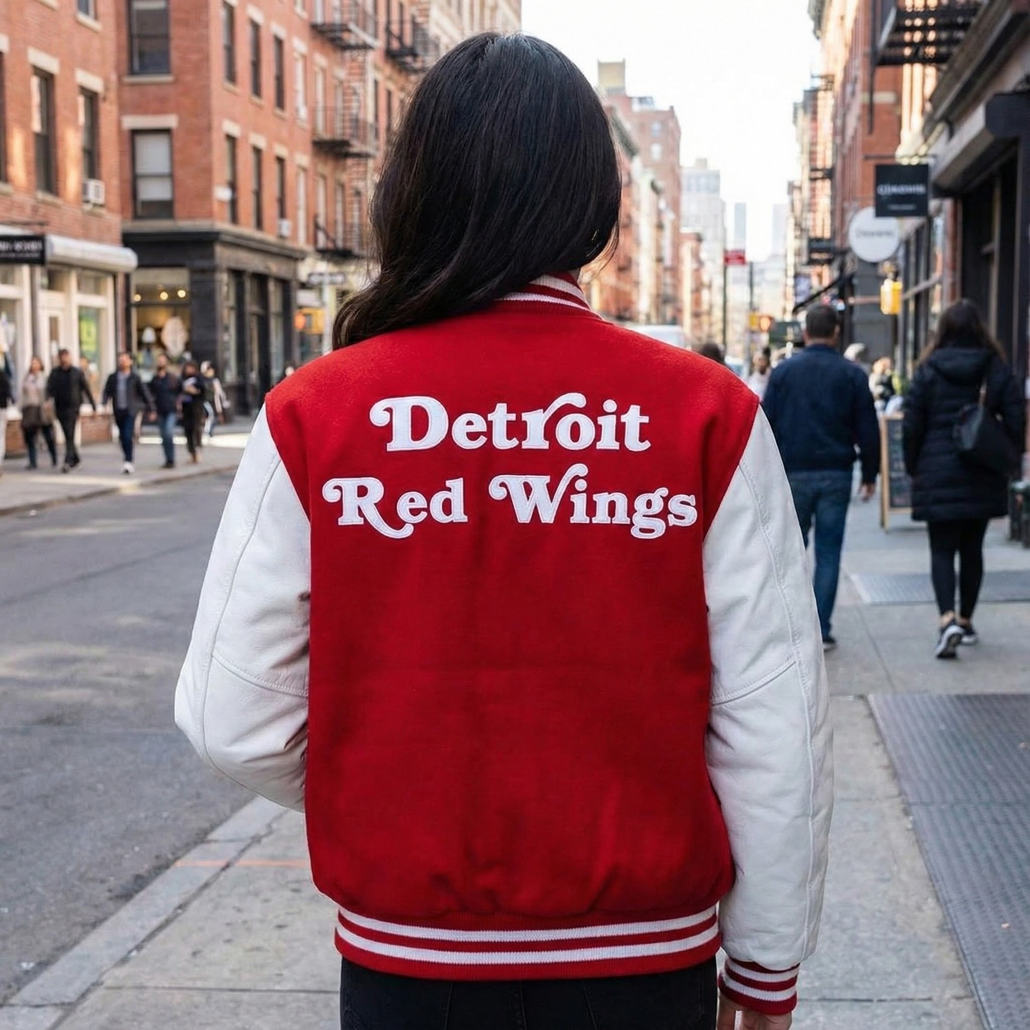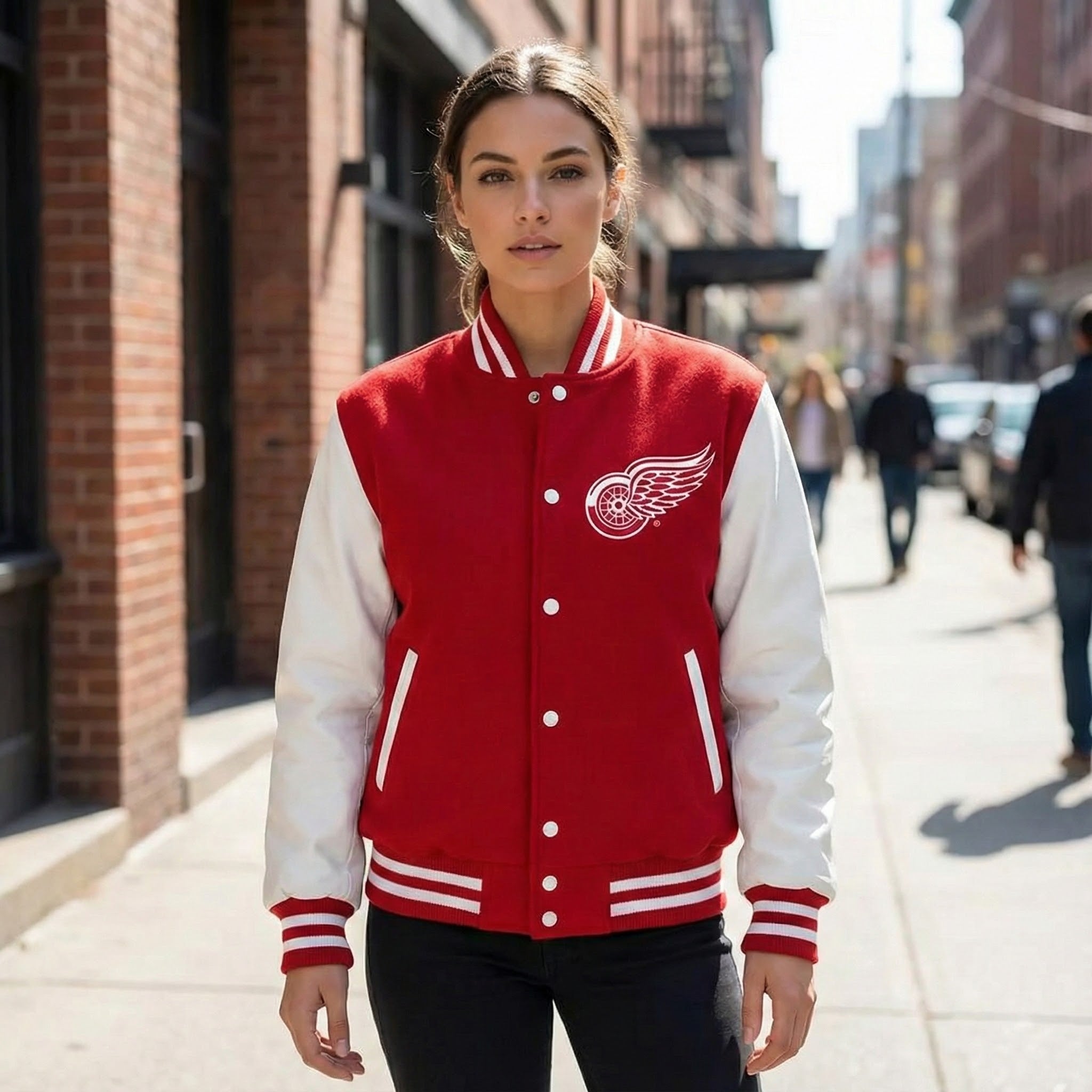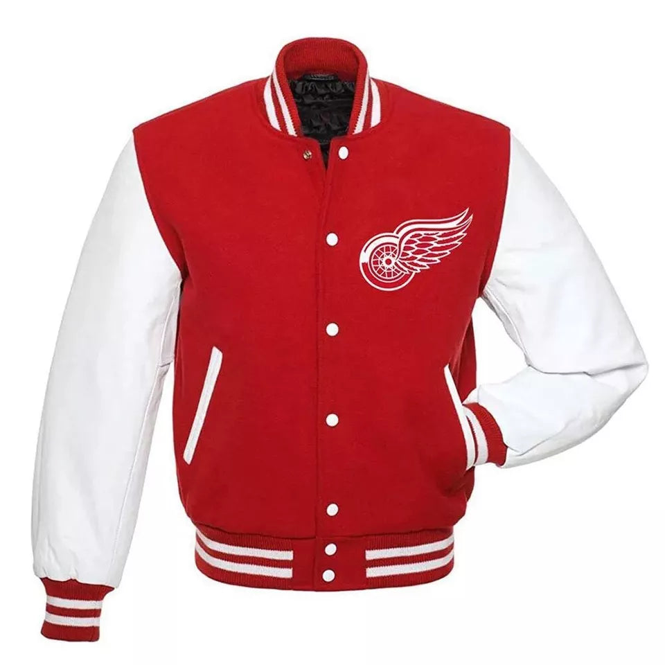 Detroit Red Wings Letterman Varsity jacket wool & genuine leather sleeves red and white
